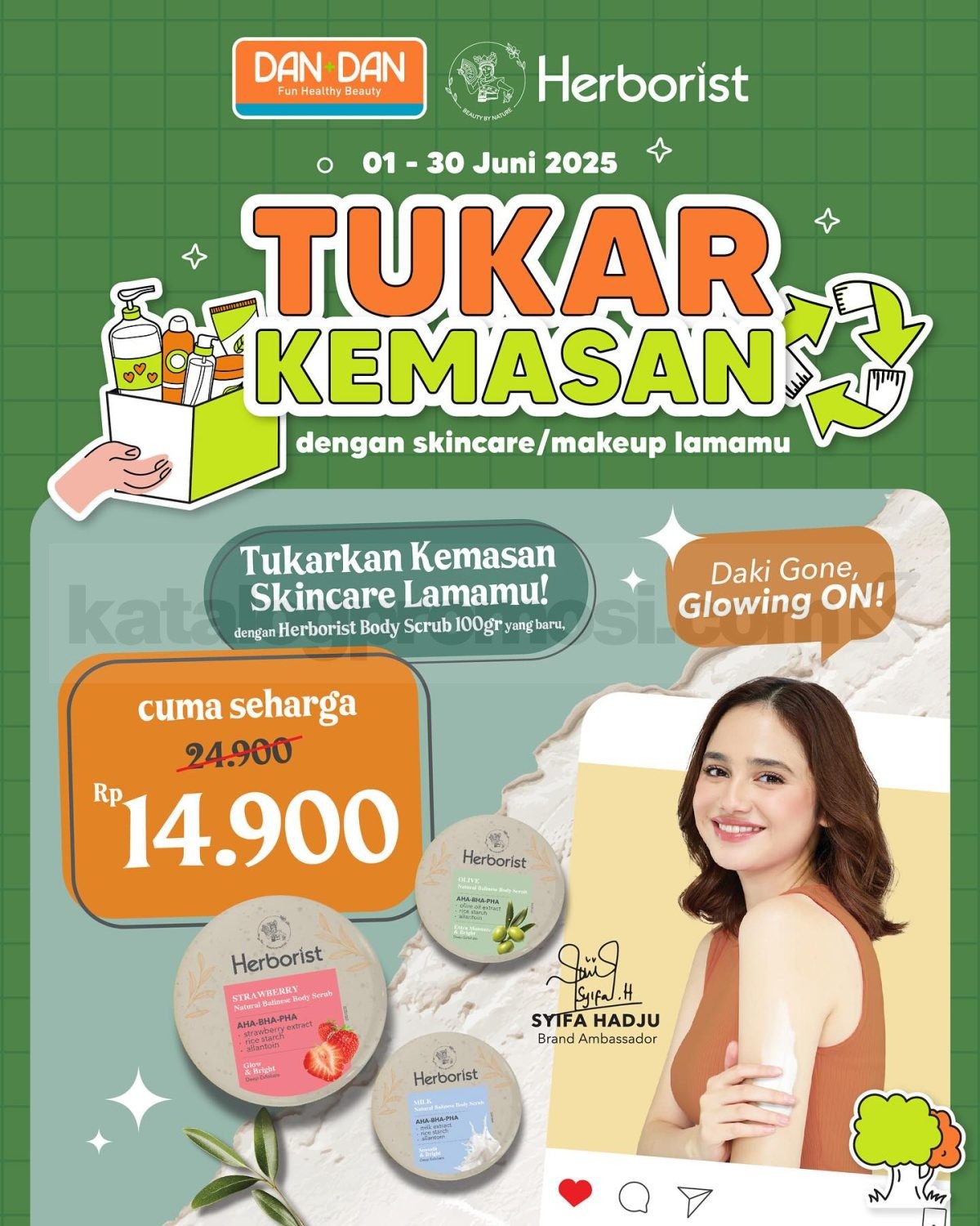 Promo Dan+Dan x Herborist tukar kemasan bekas jadi body scrub cuma Rp14.900! Berlaku 1โ30 Juni 2025 di seluruh gerai Dan+Dan. Ayo bantu bumi sambil cantik-cantikan!