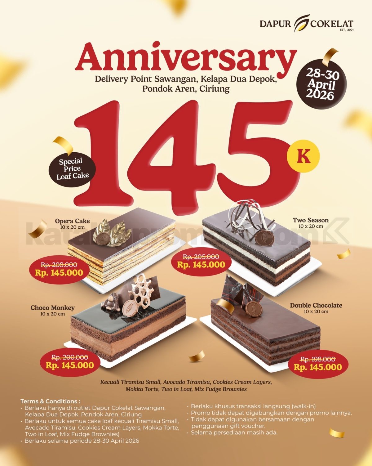 Promo Dapur Cokelat Anniversary Loaf Cake Rp. 145.000 diskon dari harga normal untuk varian pilihan, berlaku 28 April 2026 – 30 April 2026 di lokasi tertentu.