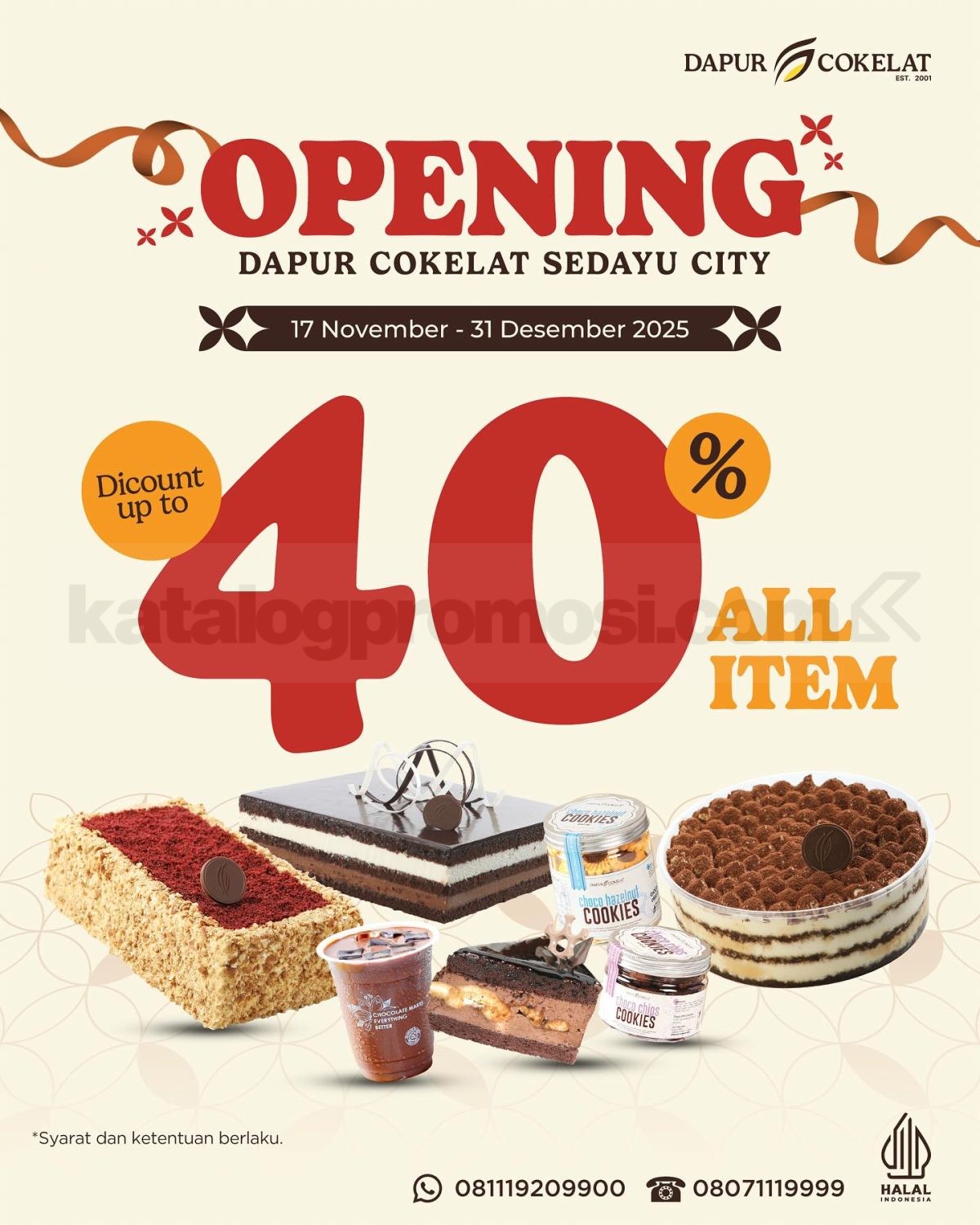 Promo Dapur Cokelat Grand Opening Sedayu City diskon hingga 40% dengan minimum transaksi tertentu, free flow chocolate fountain, berlaku 17 November 2025 – 31 Desember 2025 di Sedayu City.