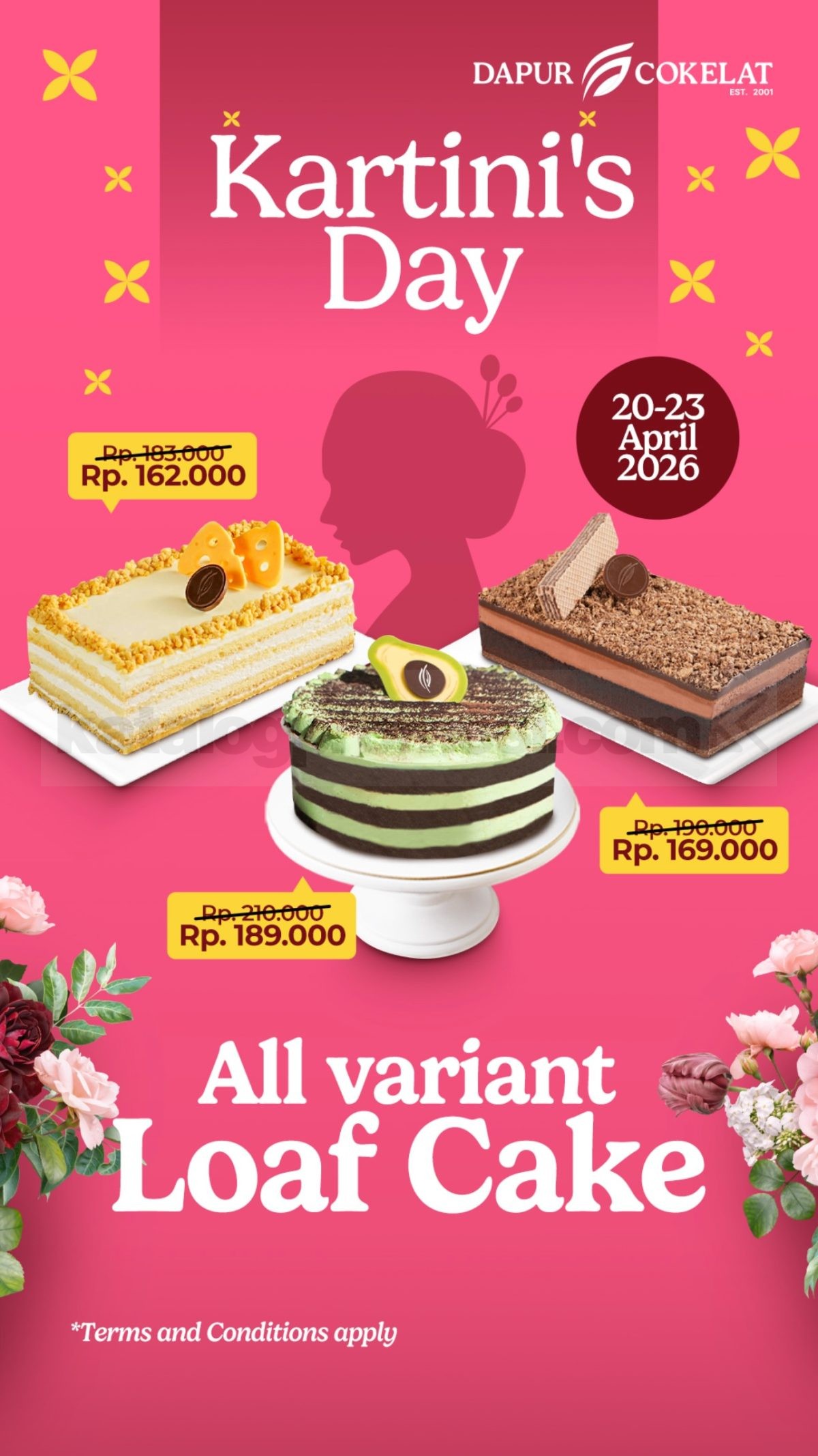 Promo Dapur Cokelat Hari Kartini Loaf Cake Diskon Rp. 21.000 berlaku saat melakukan transaksi langsung walk-in di outlet atau melalui pemesanan WhatsApp 081119209900 pada delivery point Dapur Cokelat selama periode 20–23 April 2026 sesuai ketentuan program.