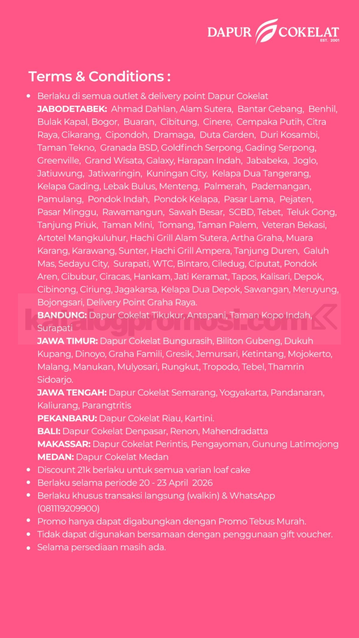 - Promo berlaku di semua outlet dan delivery point Dapur Cokelat.