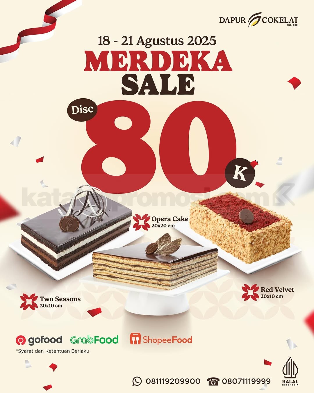 Promo Dapur Cokelat Merdeka Sale mulai Rp99.000 berlaku 18โ21 Agustus 2025 di Gofood, Grabfood, dan Shopeefood dengan diskon hingga Rp80.000 per cake.