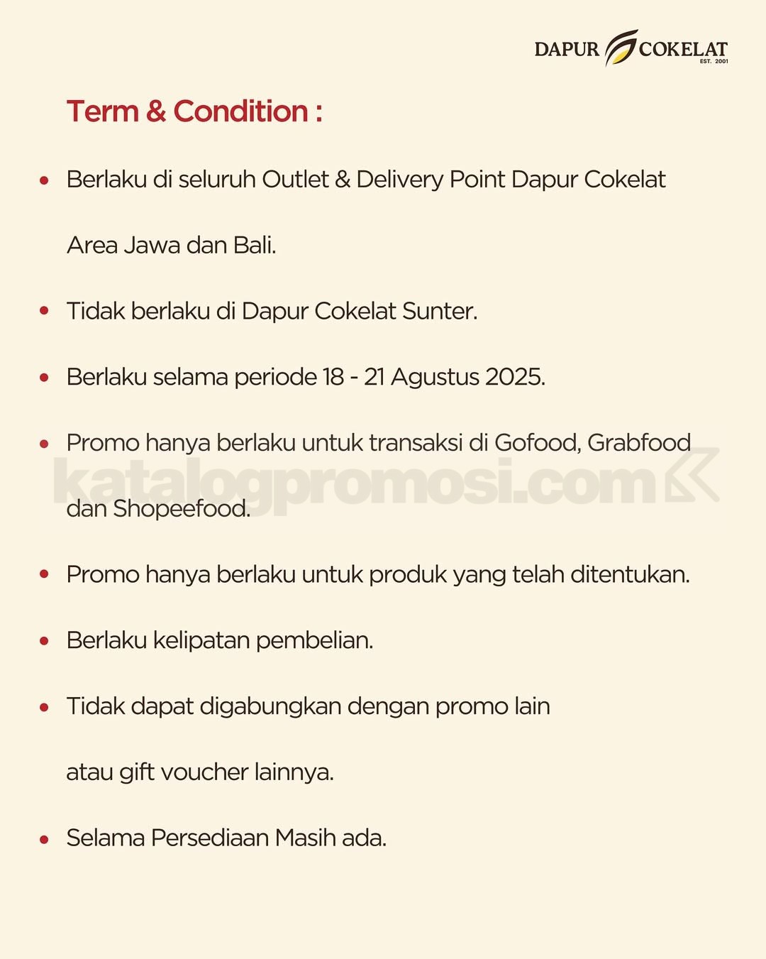 - Berlaku di seluruh outlet dan delivery point Dapur Cokelat area Jawa dan Bali (kecuali Sunter)