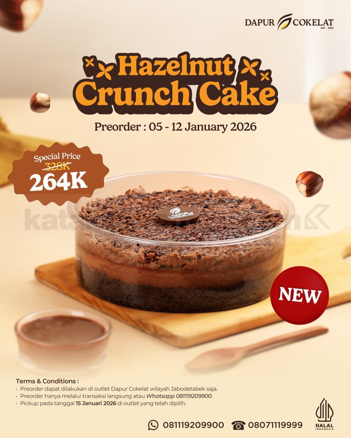 Promo Dapur Cokelat New Hazelnut Crunch Cake Rp. 264.000 dengan harga pre-order dan bonus spoon, berlaku mulai tanggal 5 – 12 Januari 2026 di lokasi tertentu Jabodetabek.