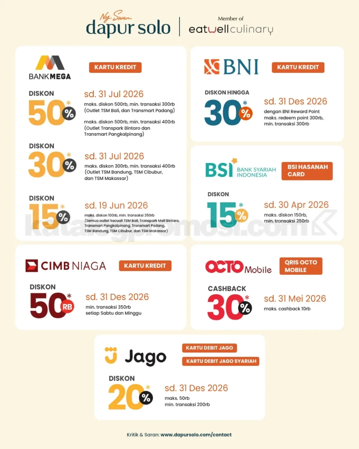 Yuk, rencanakan momen makan seru kamu bareng orang terdekat sambil menikmati berbagai potongan menarik dari Promo Dapur Solo ini. Dengan pilihan kartu bank yang beragam, kamu bisa lebih fleksibel dan tetap hemat saat menikmati menu favorit.