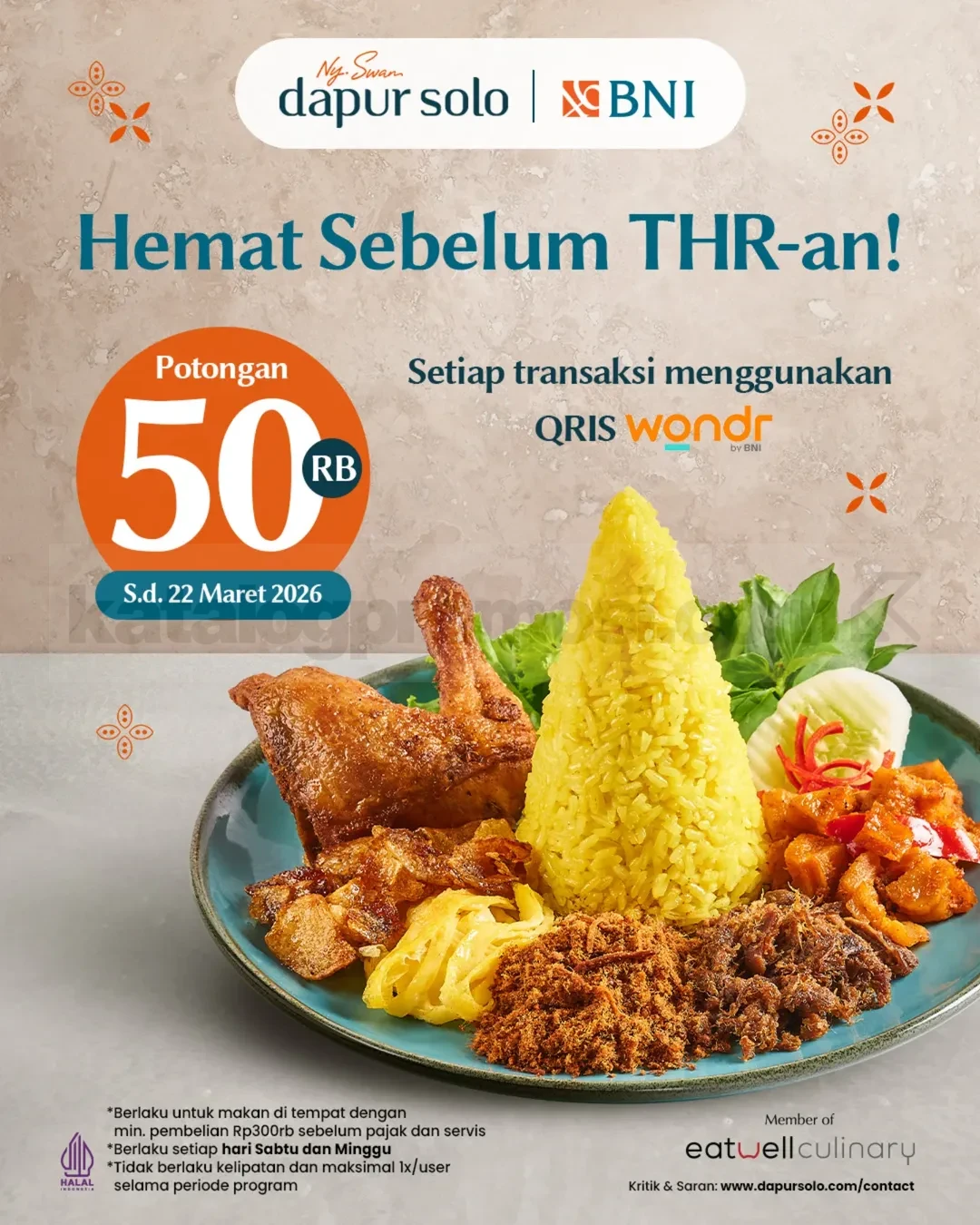 Promo Dapur Solo QRIS Wondr BNI Diskon Rp. 50.000 untuk transaksi minimal Rp300.000 makan di tempat, berlaku sampai tanggal 22 Maret 2026.