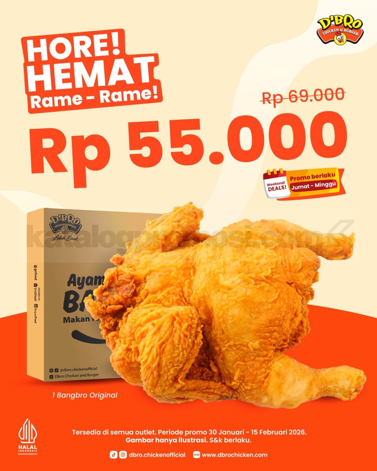 Promo D’BRO Chicken Hemat Rame-Rame mulai Rp. 55.000 dengan menu Bangbro Original untuk makan bareng, berlaku mulai tanggal 30 Januari – 15 Februari 2026 di seluruh outlet.