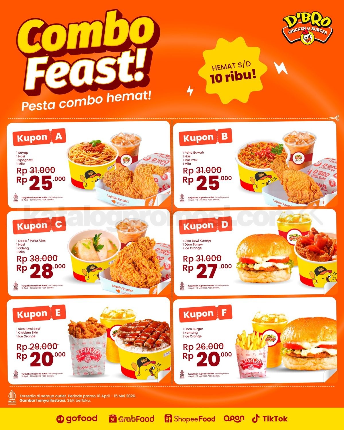 Promo D’BRO Kupon Combo Feast mulai Rp. 20.000 dengan pilihan paket combo hemat hingga Rp. 10.000 berlaku mulai tanggal 16 April 2026 – 15 Mei 2026 di seluruh outlet.