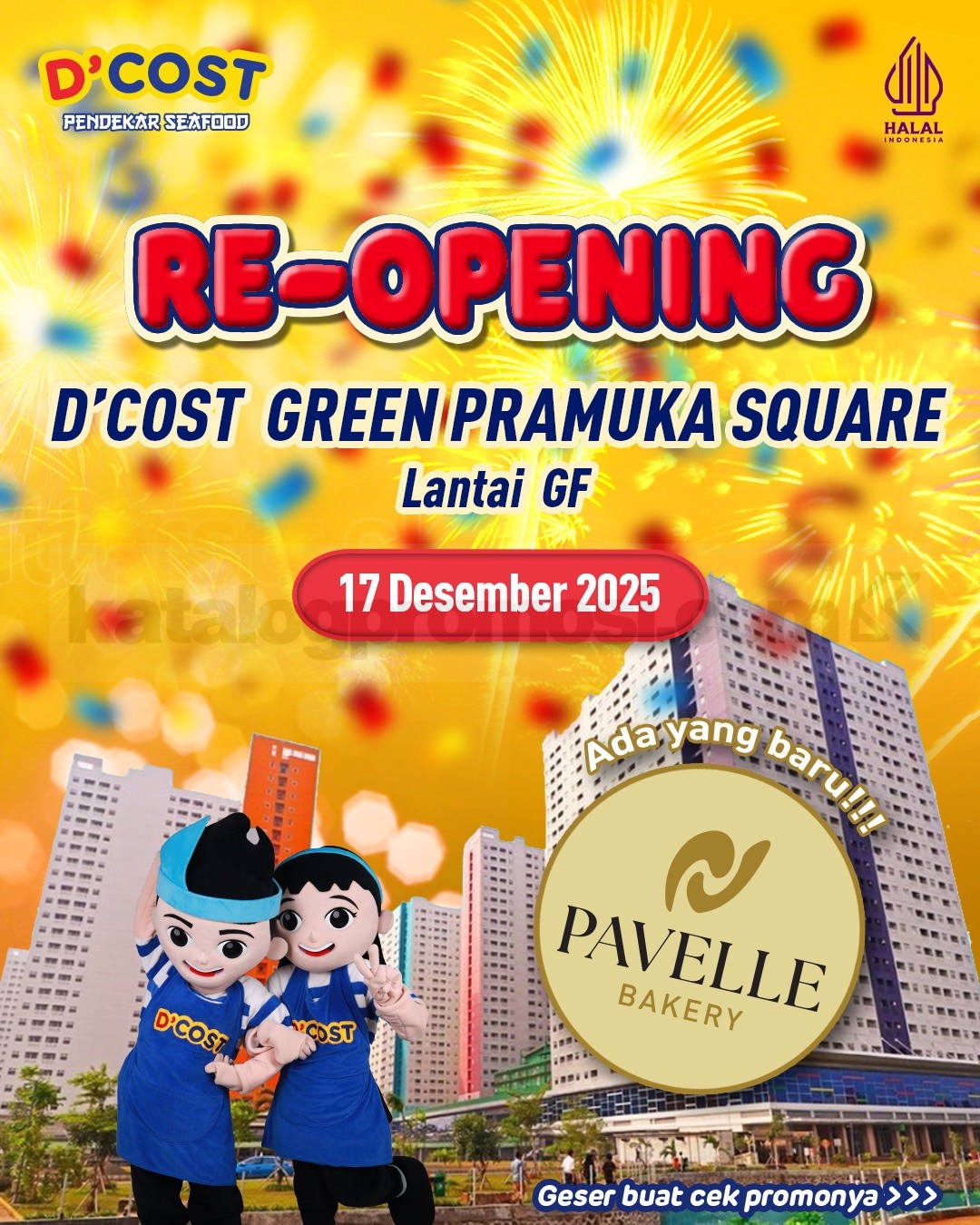 RE-OPENING D’Cost Green Pramuka Square akhirnya jadi kabar yang ditunggu para pecinta seafood. Lewat Promo D’Cost Re-Opening Green Pramuka Square Diskon Hingga 50%, momen makan bareng jadi makin seru dengan tampilan outlet yang lebih fresh dan kolaborasi spesial bersama Pavelle Bakery.