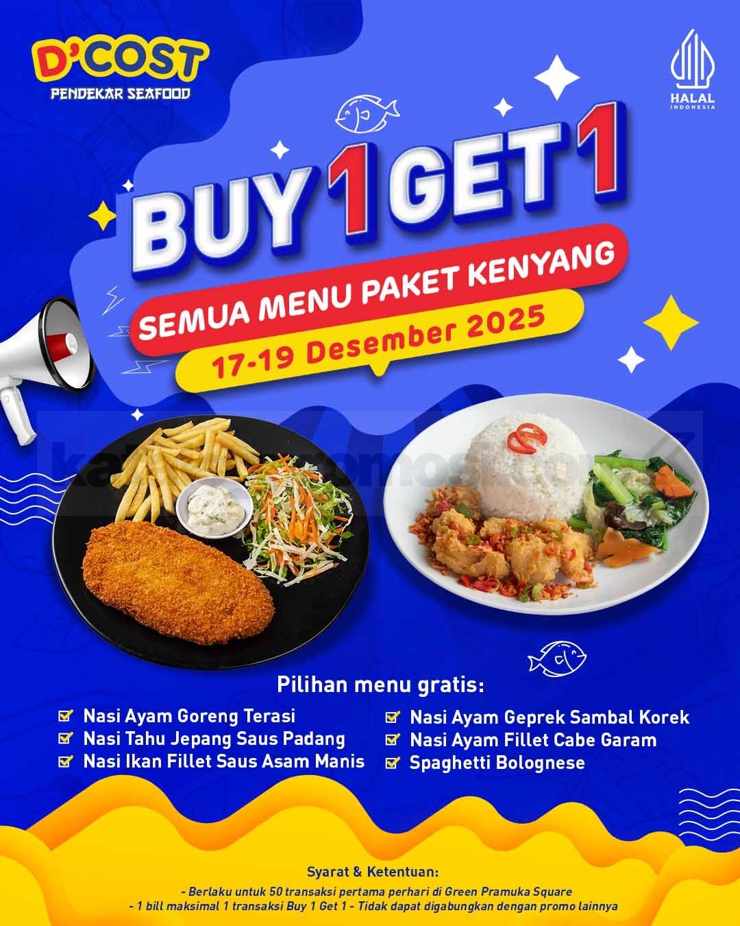 Promo D’Cost Re-Opening Green Pramuka Square Diskon Hingga 50% dengan Buy 1 Get 1 Paket Kenyang dan diskon menu pilihan, berlaku mulai tanggal 17 Desember 2025 – 19 Desember 2025 di Green Pramuka Square.
