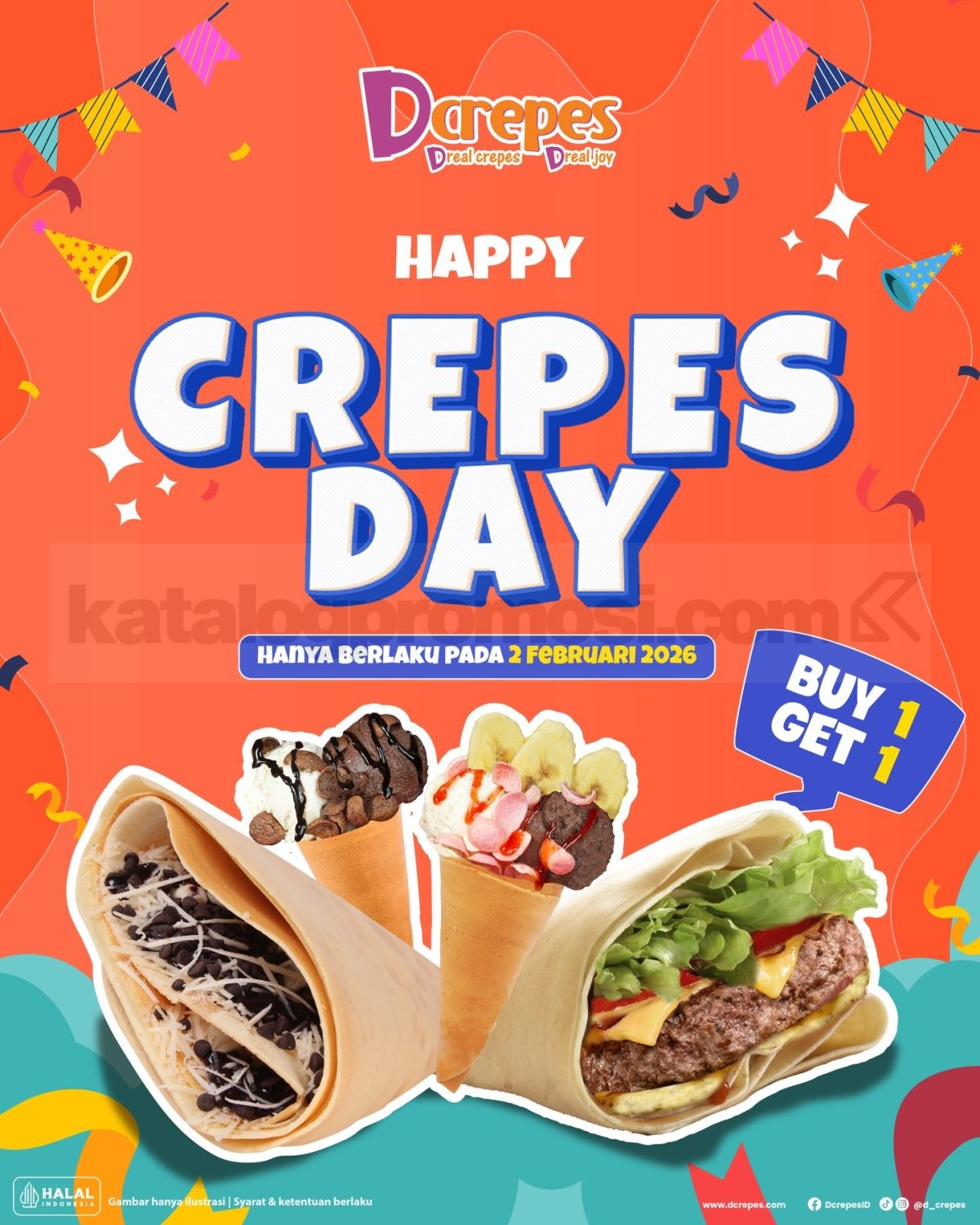 Promo Dcrepes 2.2 Crepes Day Buy 1 Get 1 berlaku khusus 2 Februari 2026 dengan kuota terbatas di seluruh outlet Dcrepes.