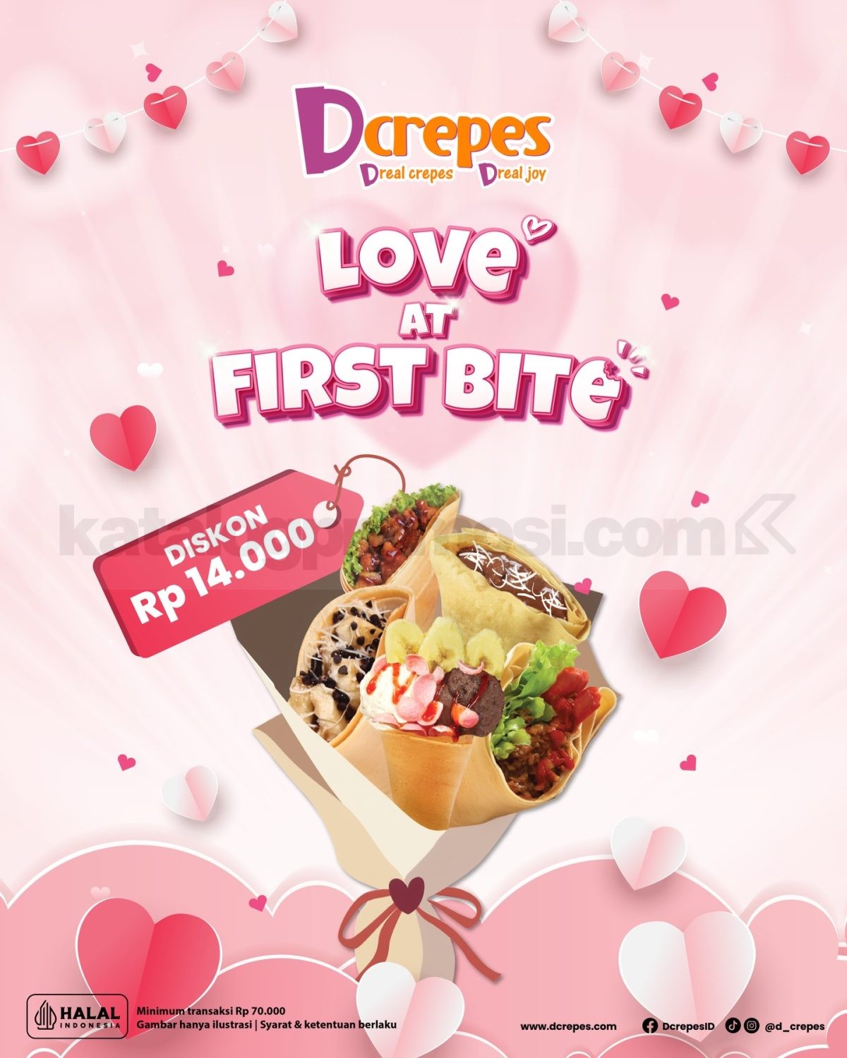 👉 Cek gambar Promo Dcrepes Love At First Bite Diskon Rp. 14.000 di bawah ini untuk lihat detail promo dan nuansa manisnya secara visual 💖