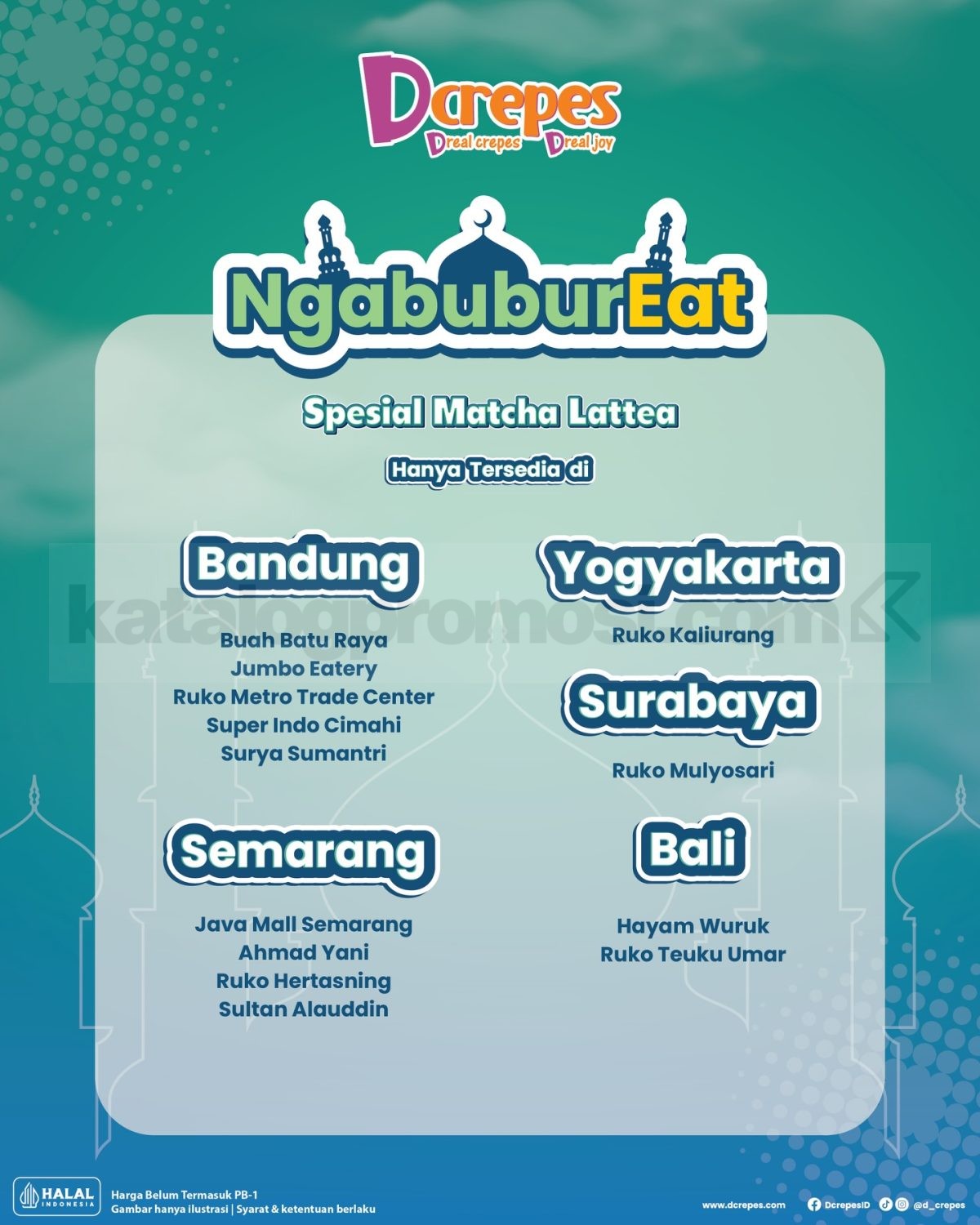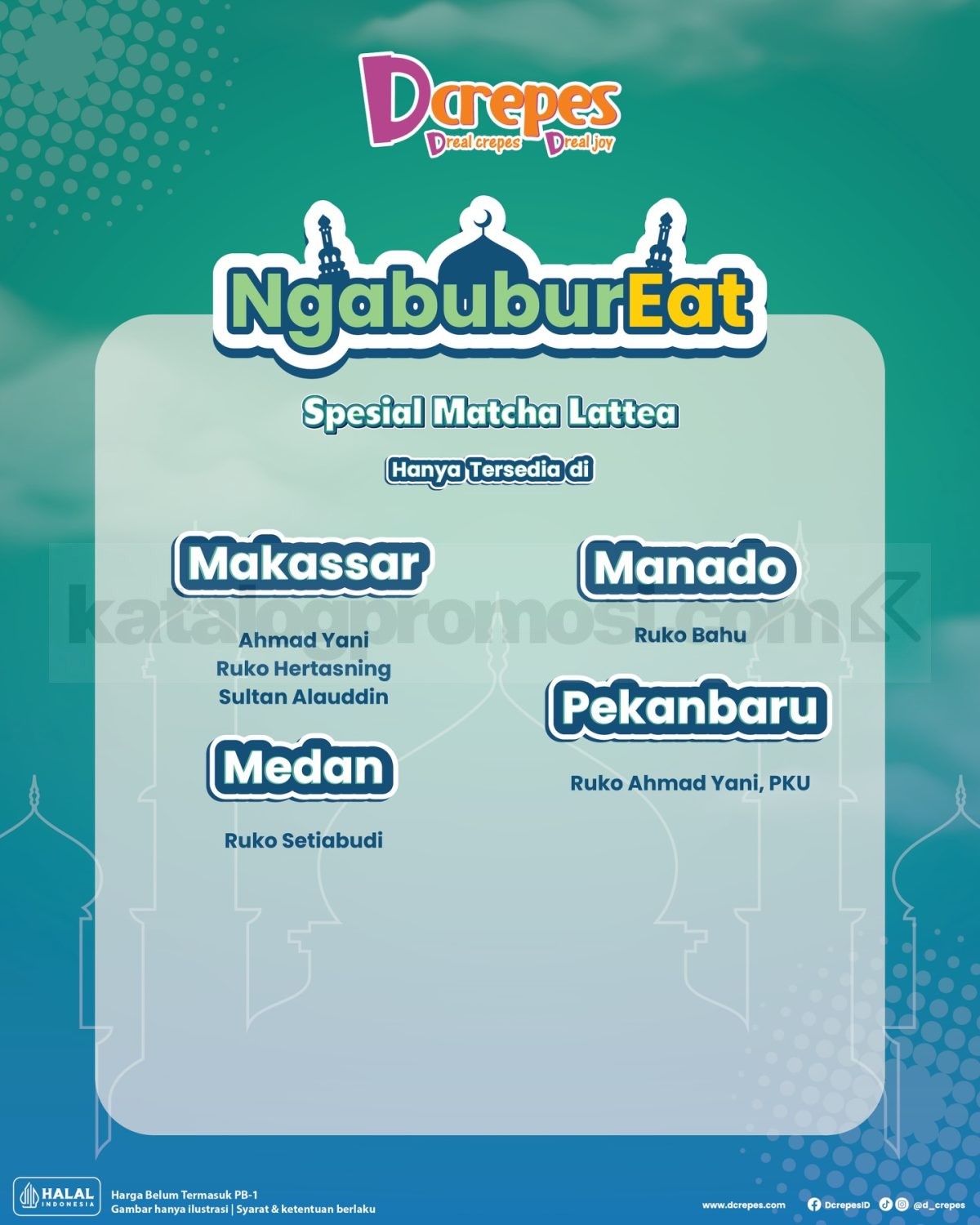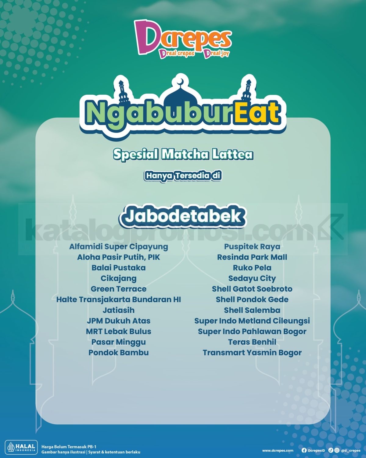 Promo ini tidak dapat digabungkan dengan promo lainnya dan tersedia sesuai lokasi yang tercantum pada materi promo. Jadi kalau lagi pengen yang manis, creamy, dan green, ini waktunya ngeMatcha bareng Dcrepes 👀