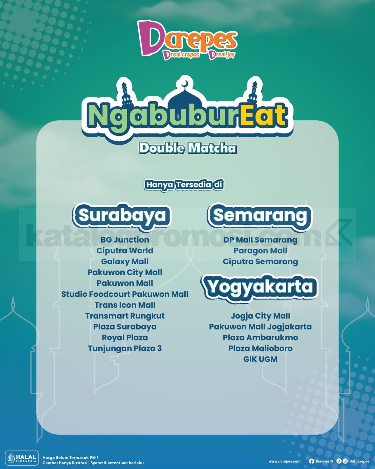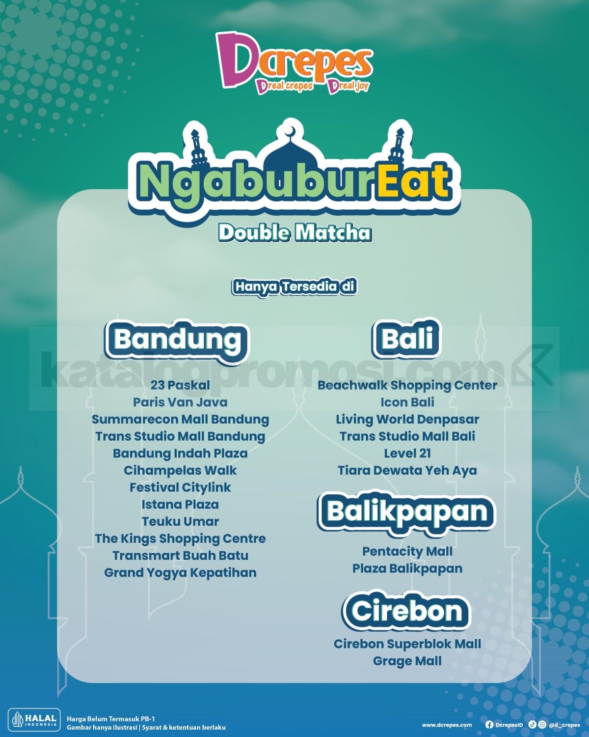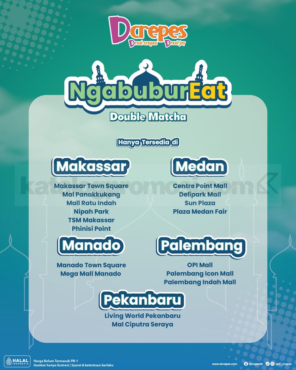 Promo ini tidak dapat digabungkan dengan promo lainnya dan tersedia sesuai lokasi yang tercantum pada materi promo. Jadi kalau lagi pengen yang manis, creamy, dan green, ini waktunya ngeMatcha bareng Dcrepes 👀