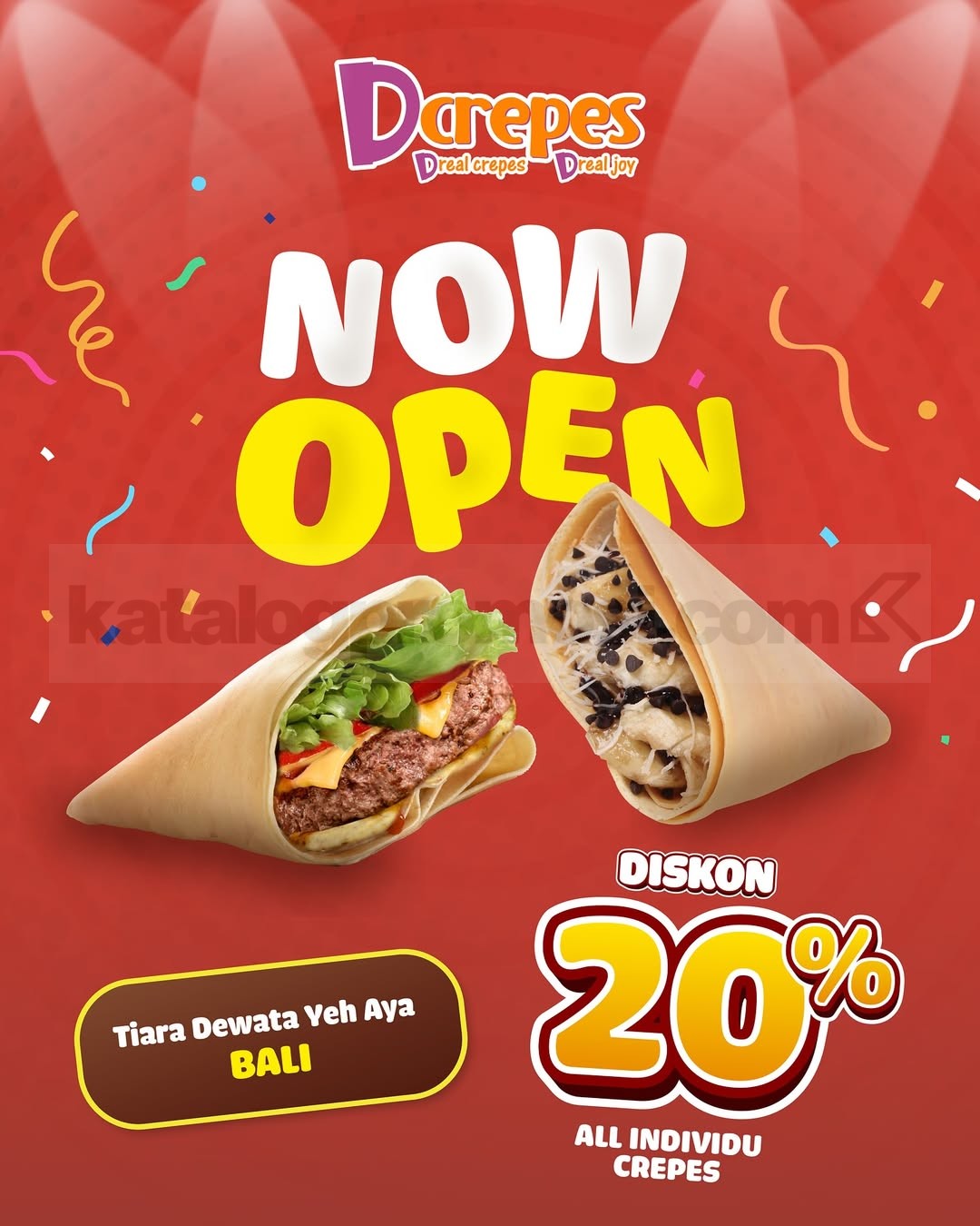 Promo Dcrepes Tiara Dewata Yeh Aya Opening Diskon 20% untuk semua individu crepes, berlaku mulai 24 Desember 2025 – 29 Desember 2025.