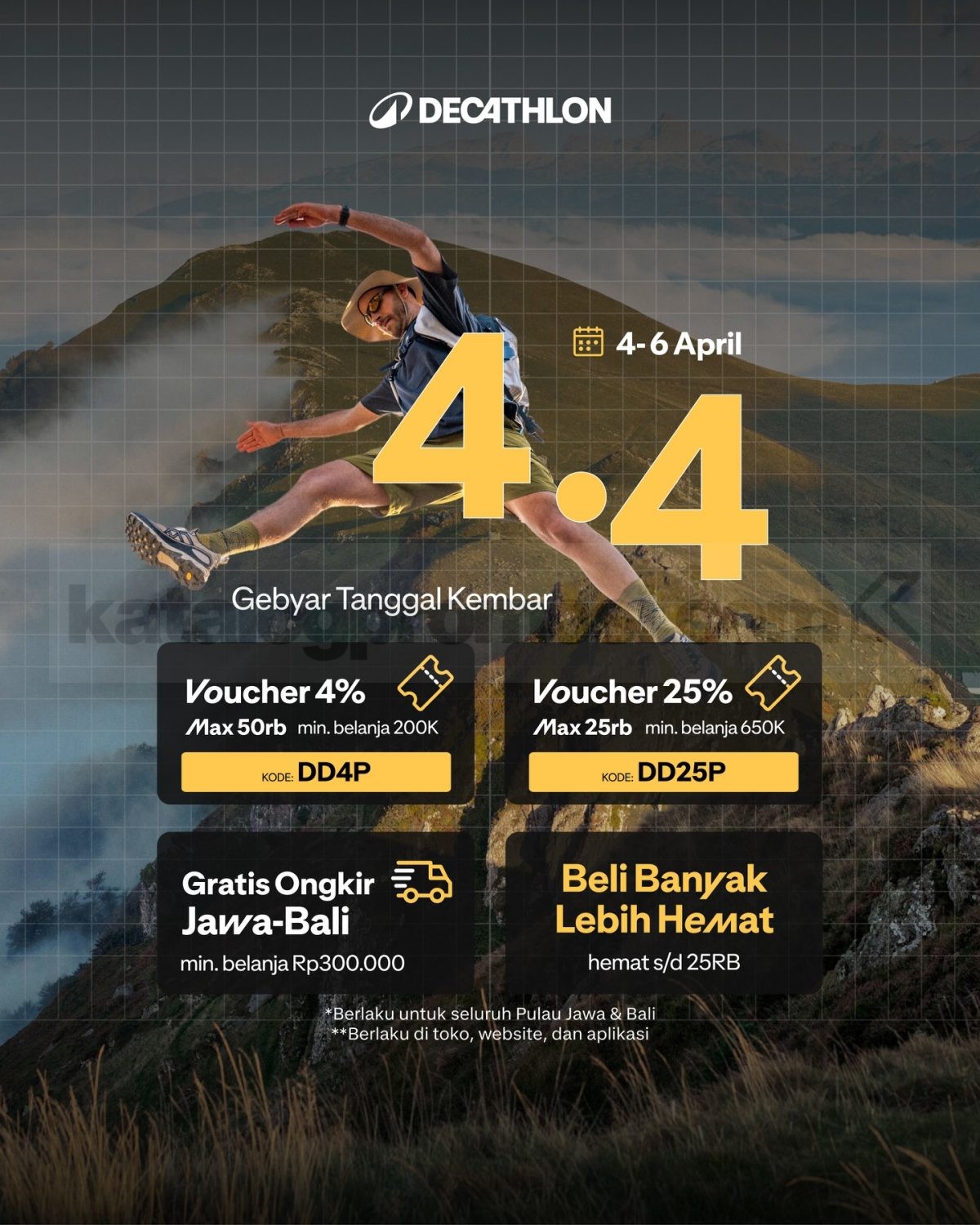 Promo Decathlon 4.4 Double Date Sale Diskon hingga 25% periode 4 – 6 April 2026 untuk pembelian di toko, website, dan aplikasi Decathlon Indonesia dengan voucher hingga 25%, potongan Rp. 25.000, dan GRATIS ongkir Jawa-Bali.