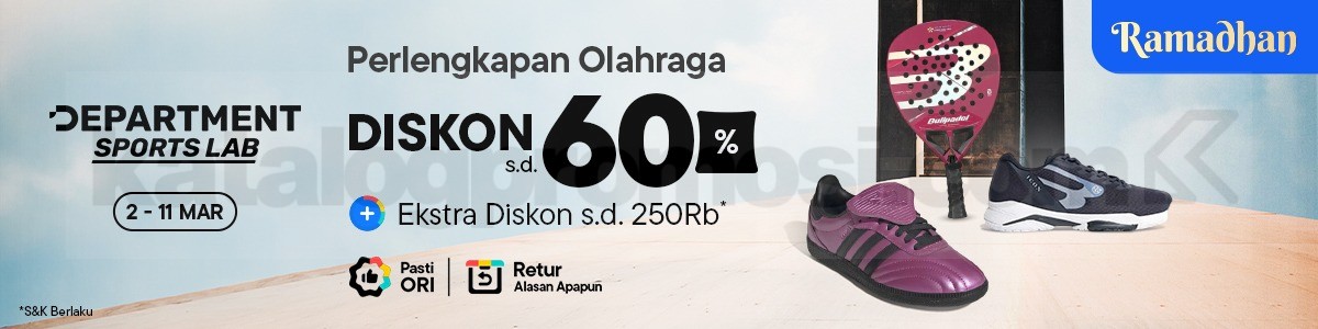 Promo Department Sports Lab Blibli Ramadhan Diskon 60% untuk perlengkapan olahraga + voucher ekstra 20%. Berlaku mulai tanggal 2 Maret 2026 – 11 Maret 2026.