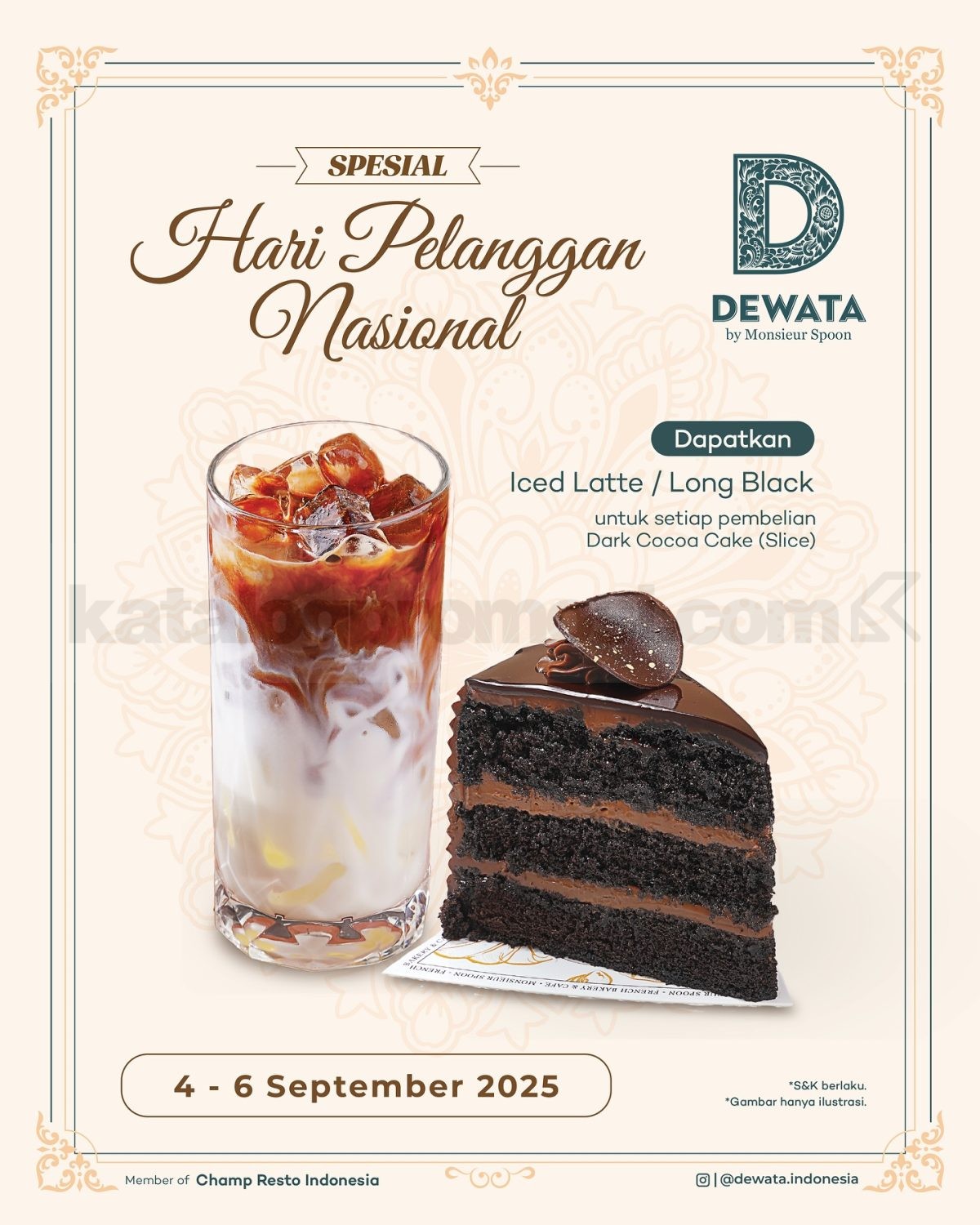 Promo Dewata Harpelnas free Latte atau Long Black berlaku 4 – 6 September 2025 di seluruh outlet Dewata by Monsieur Spoon dengan pembelian Dark Cocoa Cake.