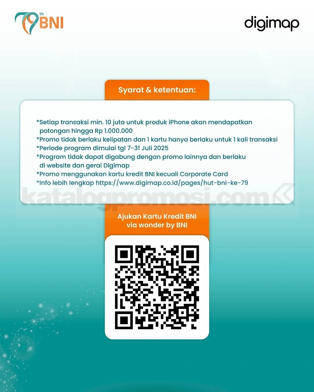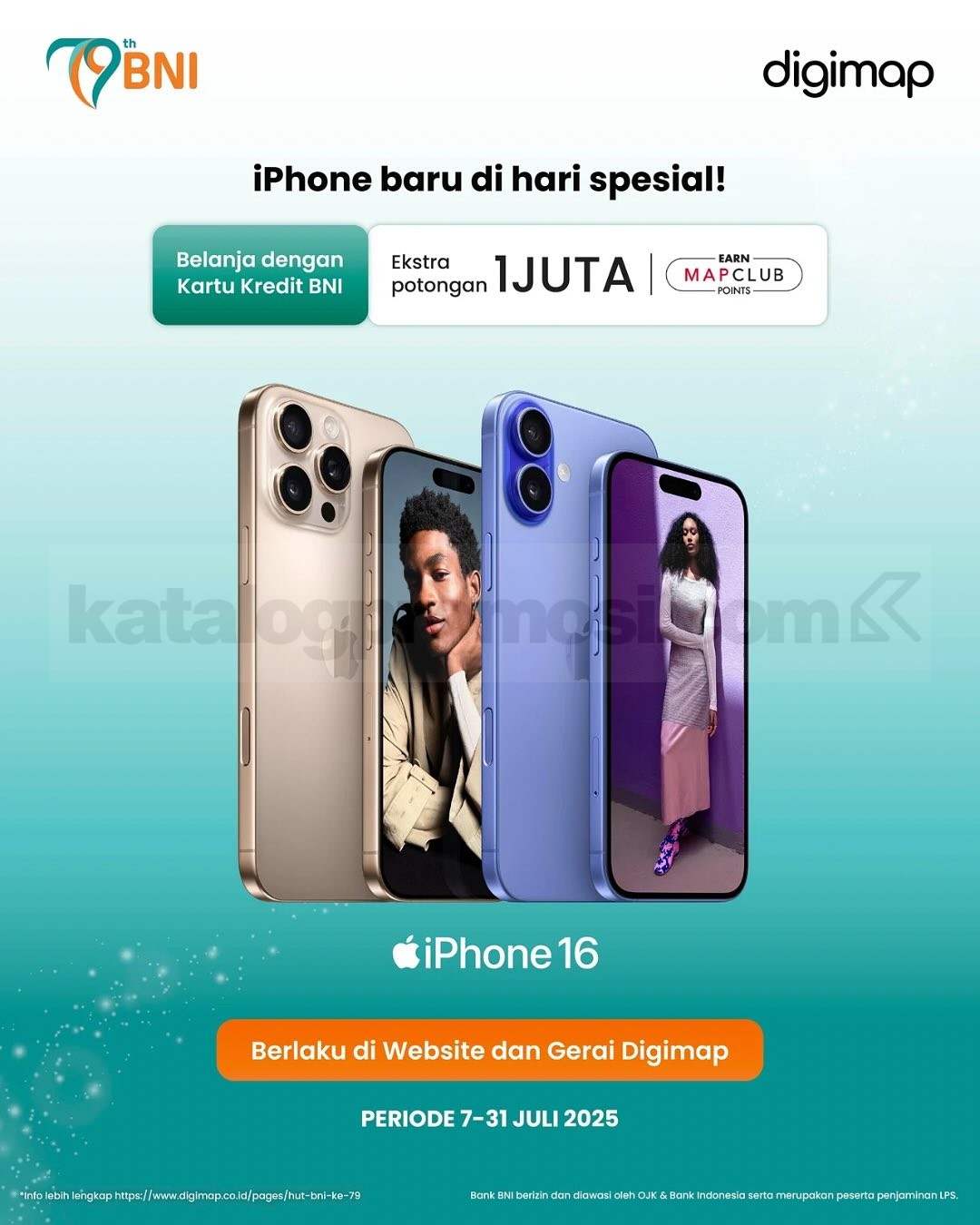 Promo DIGIMAP HUT BNI 79! Diskon iPhone dan produk Apple hingga Rp1.000.000 untuk transaksi pakai Kartu Debit & Kredit BNI, berlaku 07-21 Juli 2025