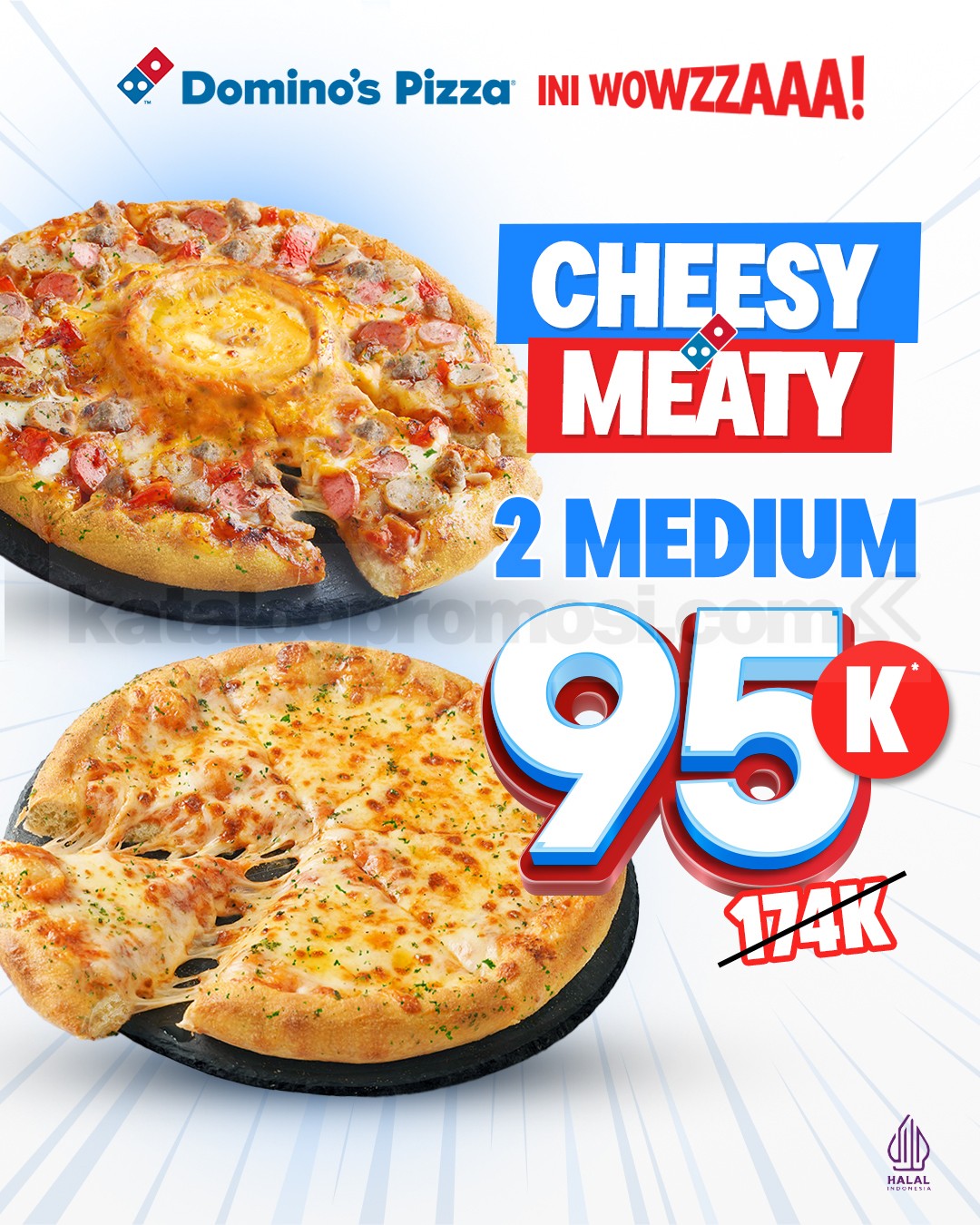 Promo Domino’s Pizza 2 Medium Cheesy Meaty Pizza hanya Rp. 95.000! Hemat 46%, bebas pilih topping favorit, berlaku sampai 2 Oktober 2025.