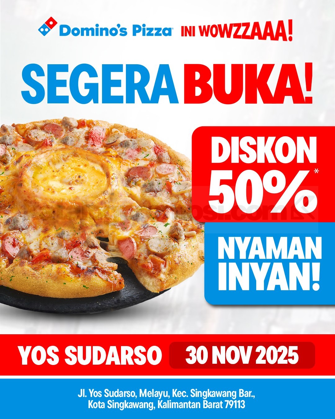 Promo Domino’s Pizza Opening Yos Sudarso Singkawang diskon 50%, nikmati pizza terbaik mulai 30 November 2025 di outlet baru kota Singkawang.