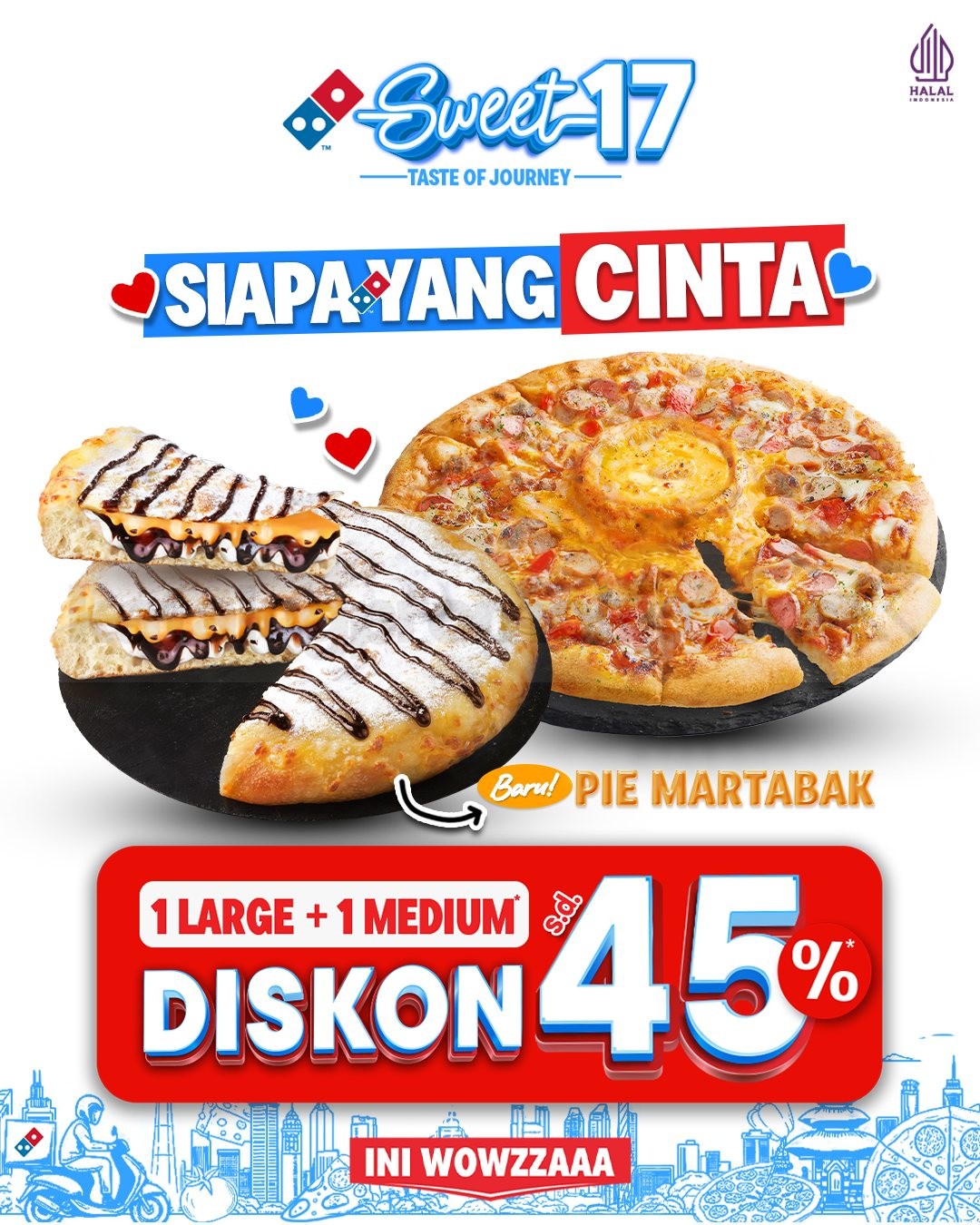 Promo Domino’s Pizza Siapa Yang Cinta Diskon 45%! Dapatkan 2 pizza favorit: 1 Large + 1 Medium dengan harga hemat.