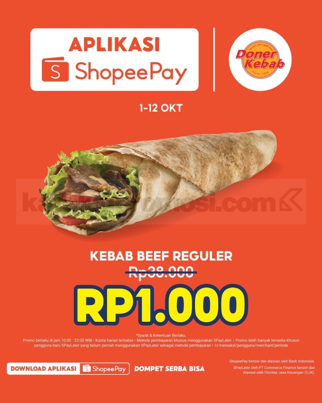 Promo Doner Kebab Harga Spesial Kebab Beef Reguler Rp 1.000 hanya di Shopee pakai SPayLater! Berlaku mulai 1-12 Oktober 2025