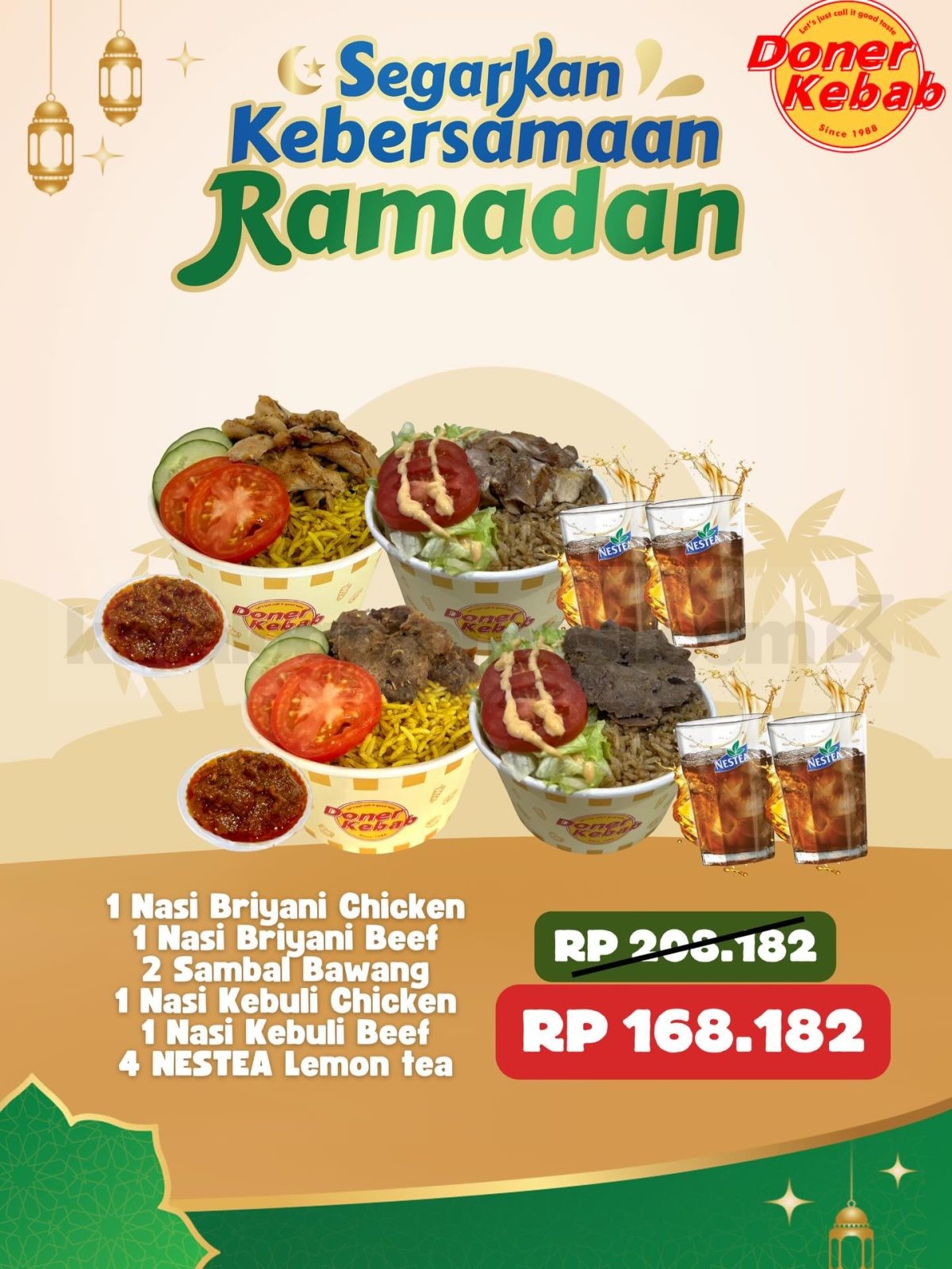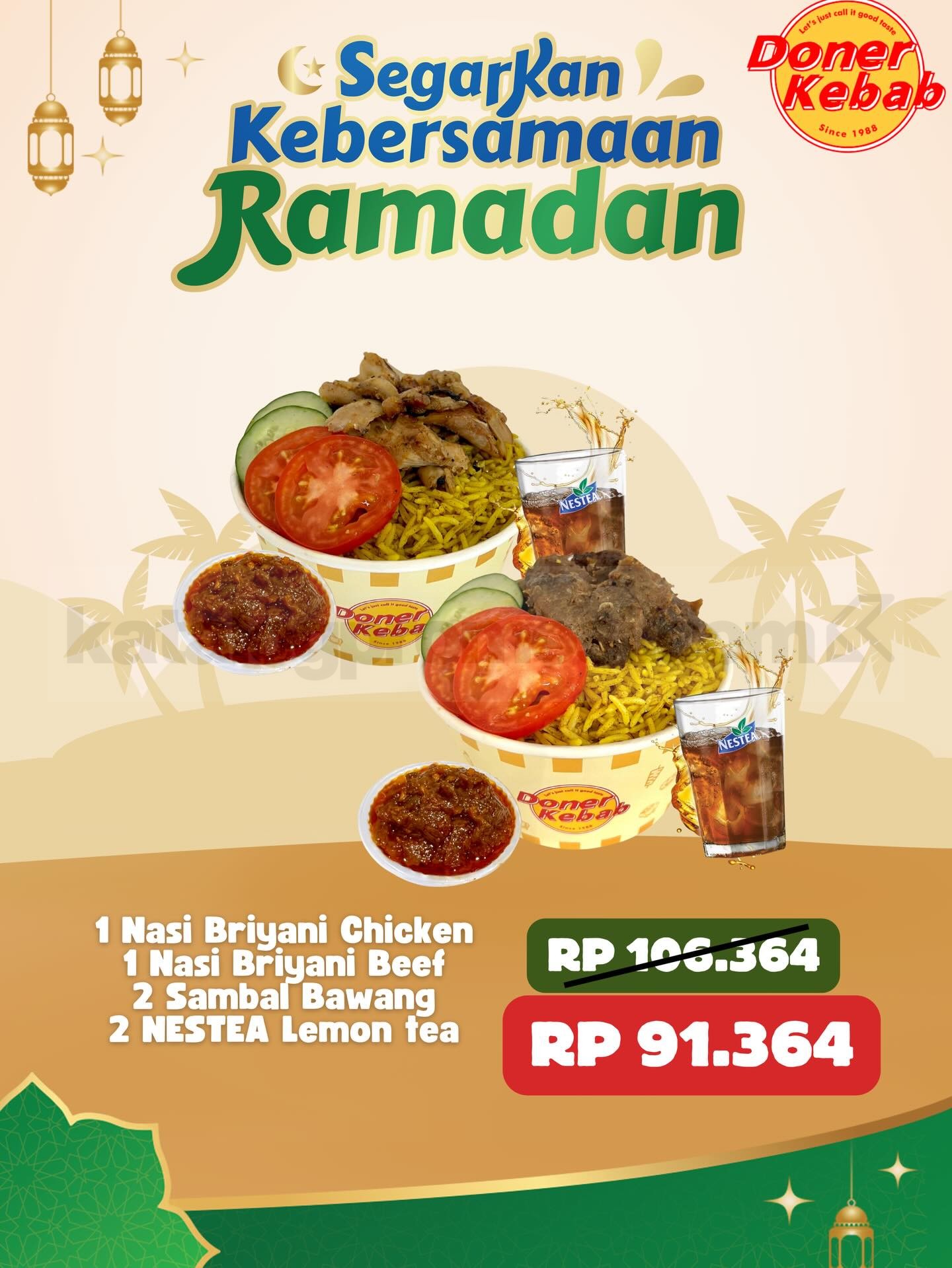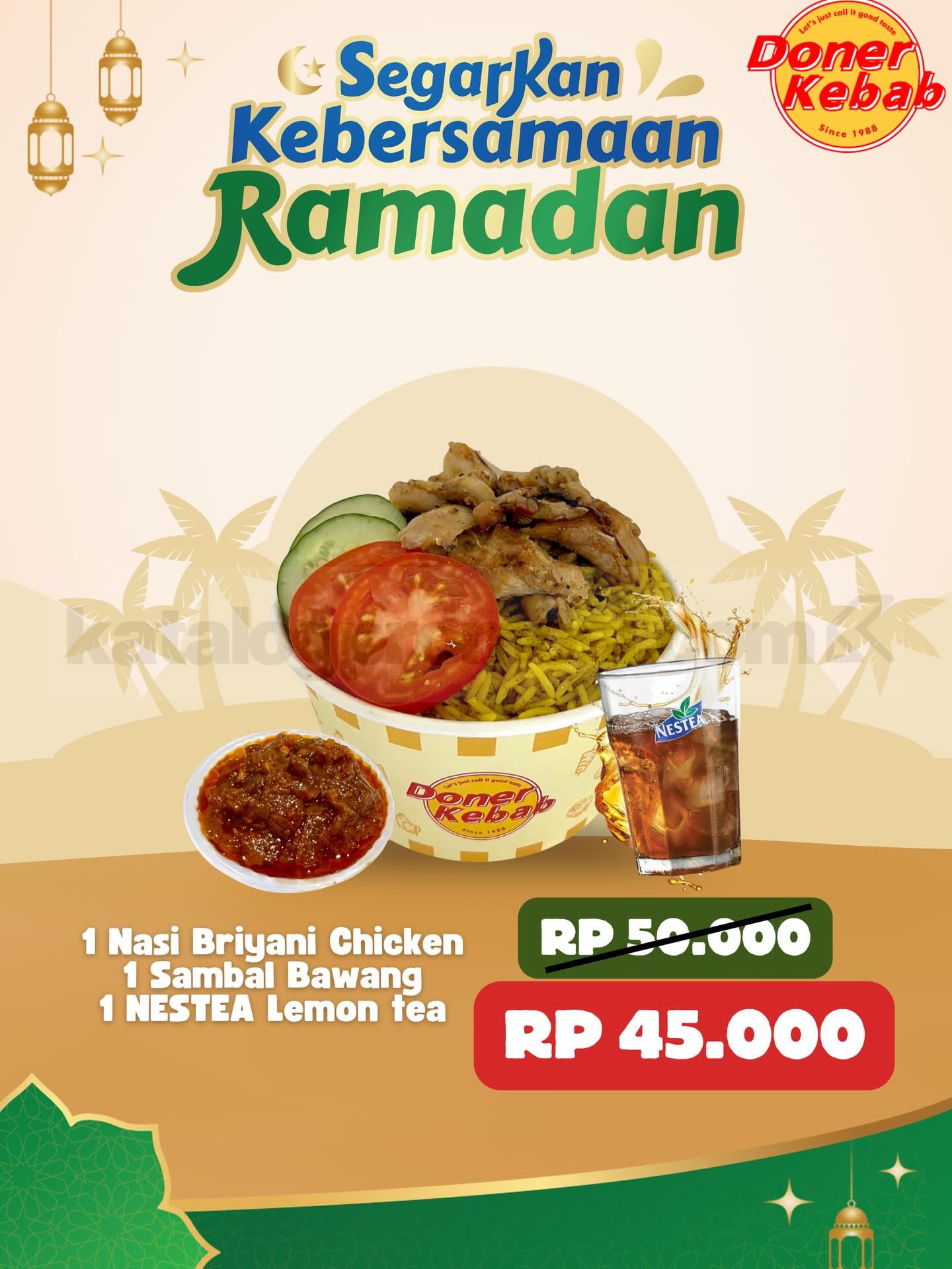 Promo Doner Kebab Ramadan Paket Hemat mulai Rp. 45.000 paket nasi briyani lengkap sambal bawang dan NESTEA Lemon Tea berlaku sampai tanggal 25 Maret 2026.
