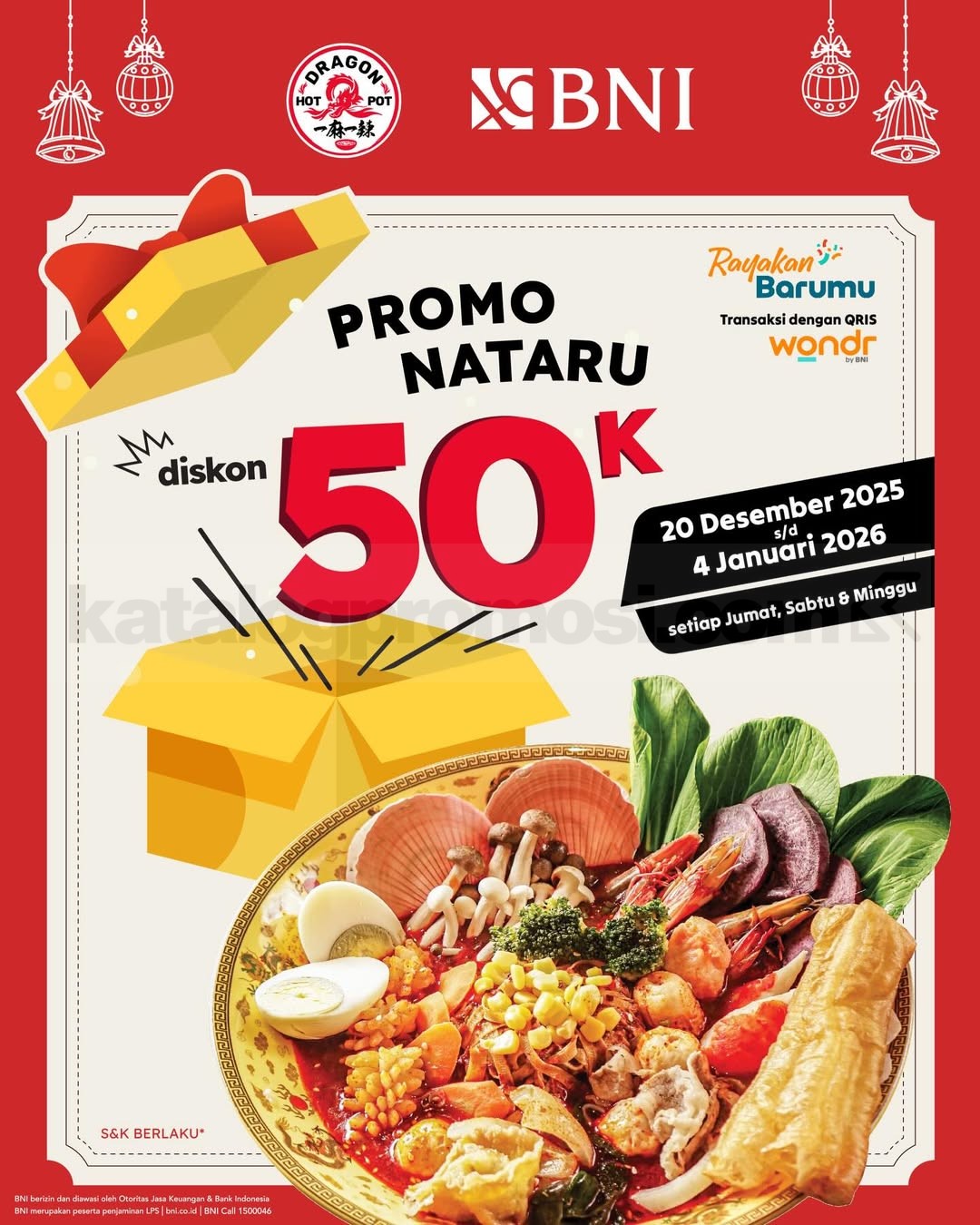 Promo Dragon Hot Pot Nataru Diskon Rp. 50.000 bayar pakai QRIS Wondr by BNI minimal Rp. 300.000 berlaku 20 Desember 2025 – 4 Januari 2026