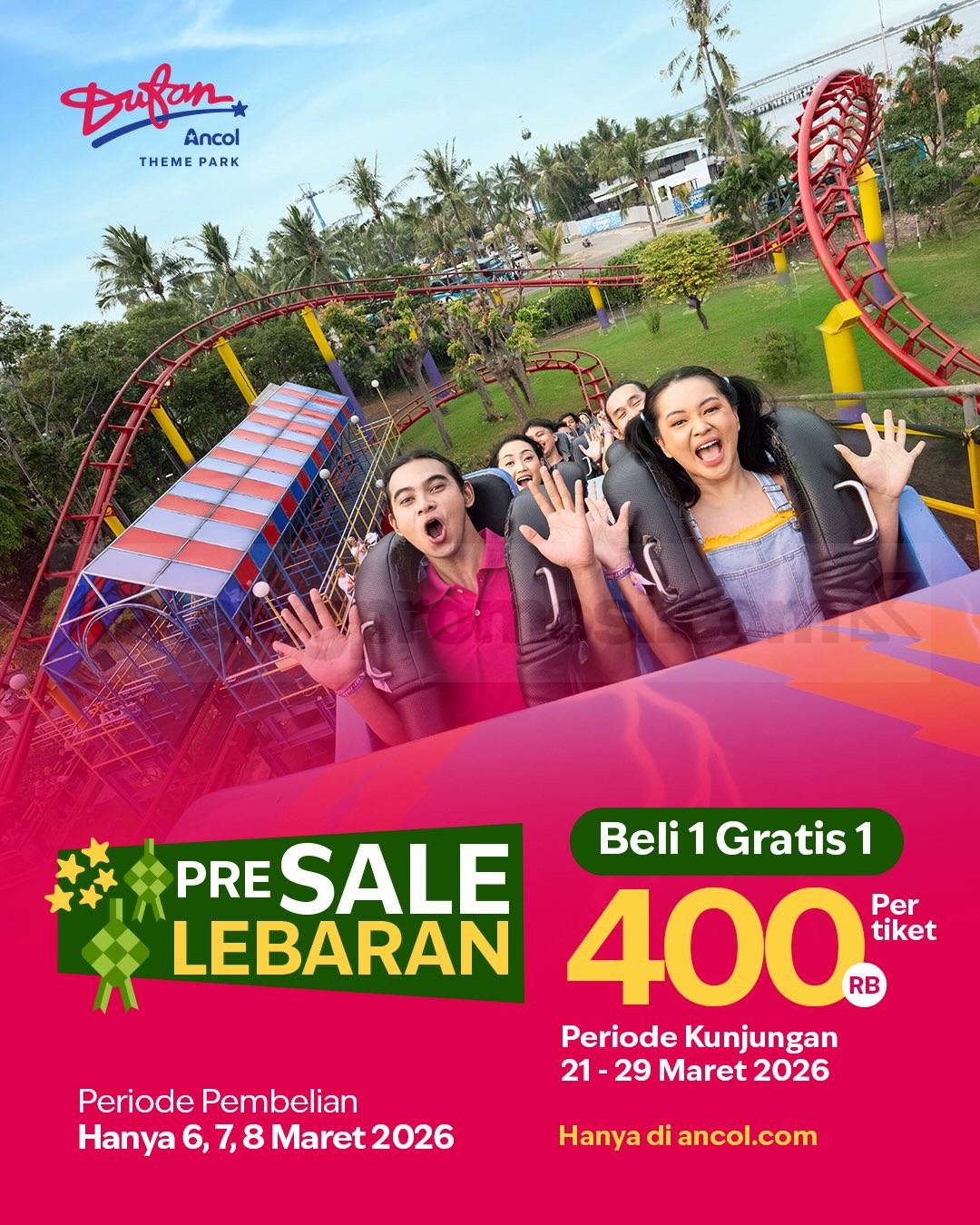 Promo Dufan Ancol Presale THR Lebaran Beli 1 GRATIS 1 periode pembelian 6 – 8 Maret 2026 untuk kunjungan 21 – 29 Maret 2026 melalui ancol.com.