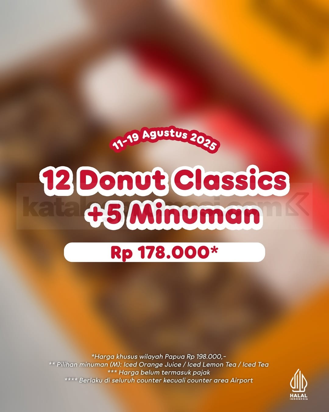 Paket terdiri dari selusin Donut Classics + 5 minuman ukuran medium.