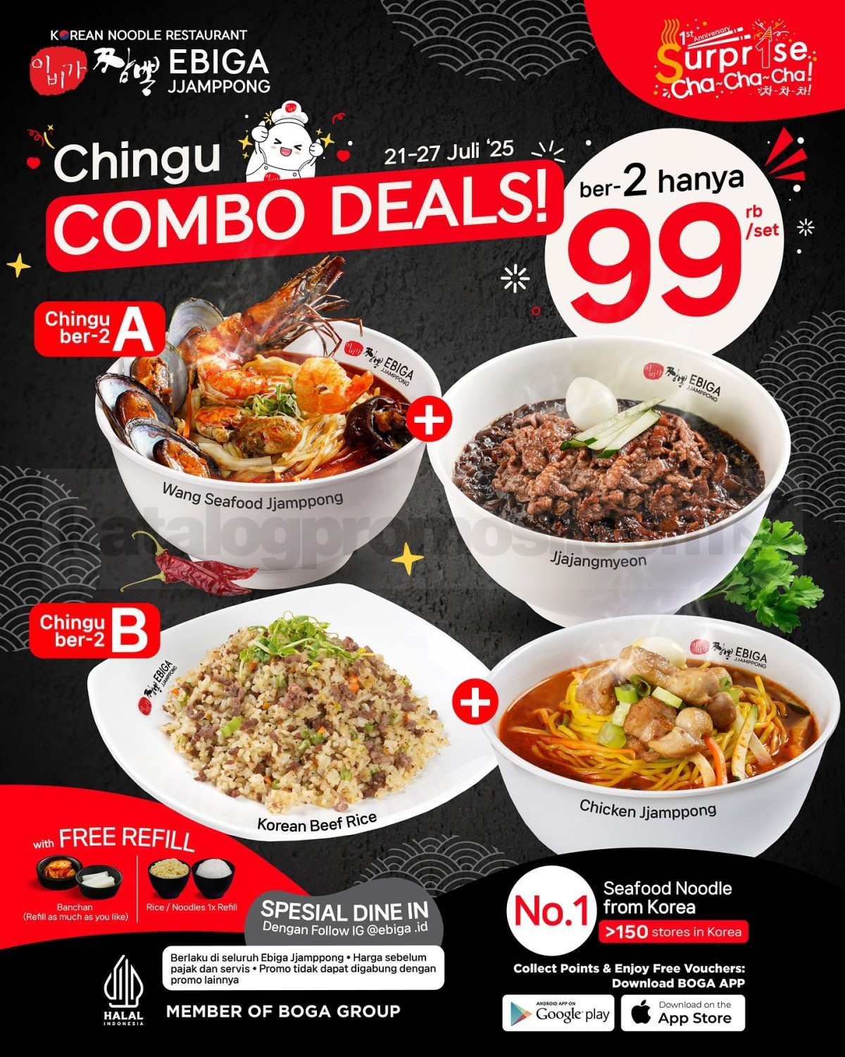 Promo Ebiga Chingu Combo Deals mulai tanggal 21 Juli 2025! Paket berdua Rp99.000 untuk Jjamppong atau Nasi + free refill, berlaku dine in seluruh outlet Ebiga