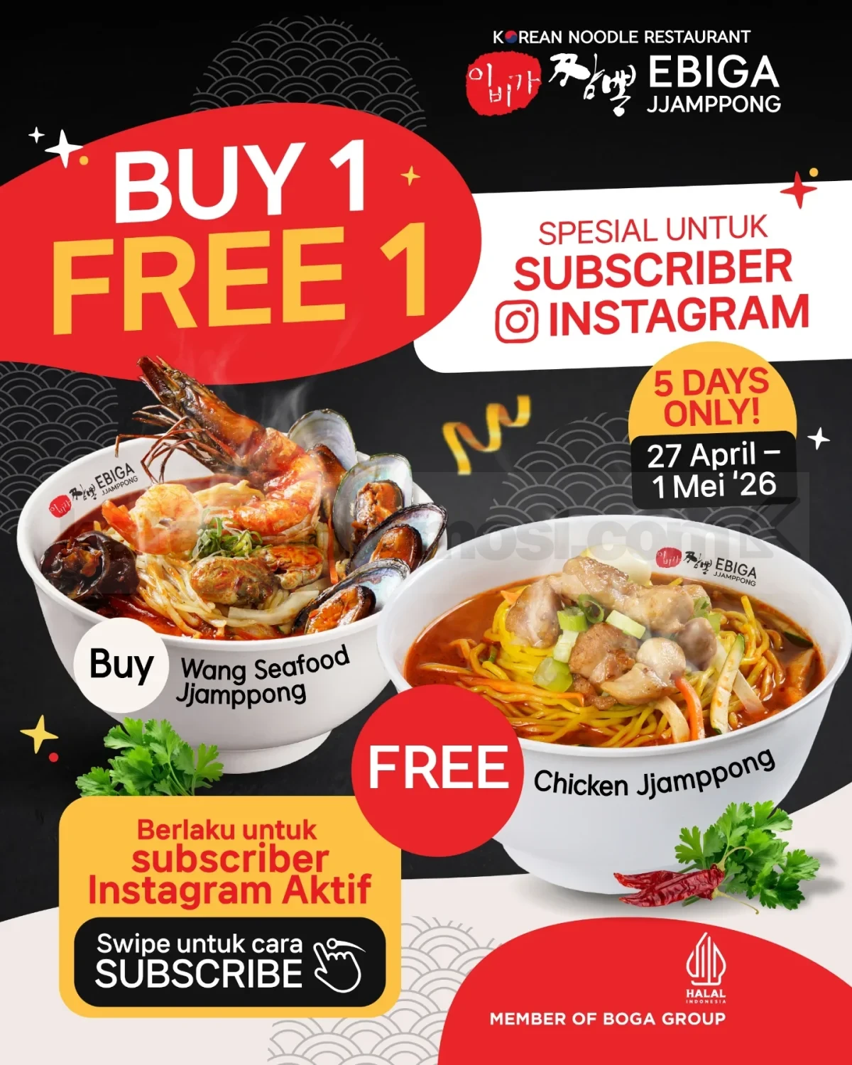 Promo Ebiga Jjamppong Buy 1 Free 1 Jjamppong Favorit akses langganan Rp9.000 beli Wang Seafood Jjamppong gratis Chicken Jjamppong berlaku 27 April 2026 – 1 Mei 2026.