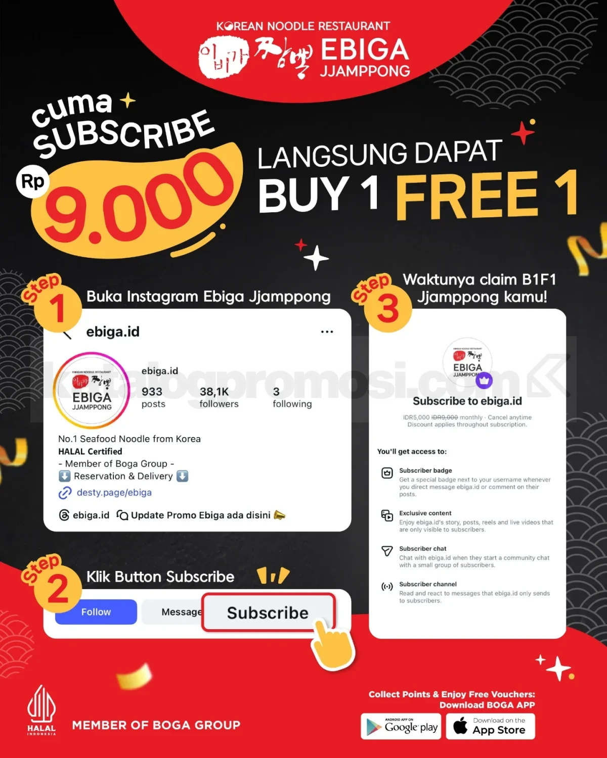 Lewat promo ini, setiap pembelian Wang Seafood Jjamppong kamu akan mendapatkan Chicken Jjamppong secara gratis. Menariknya, akses promo ini bisa kamu dapatkan dengan berlangganan Instagram Ebiga seharga Rp9.000. Praktis dan tetap hemat untuk dua porsi sekaligus! 🤩