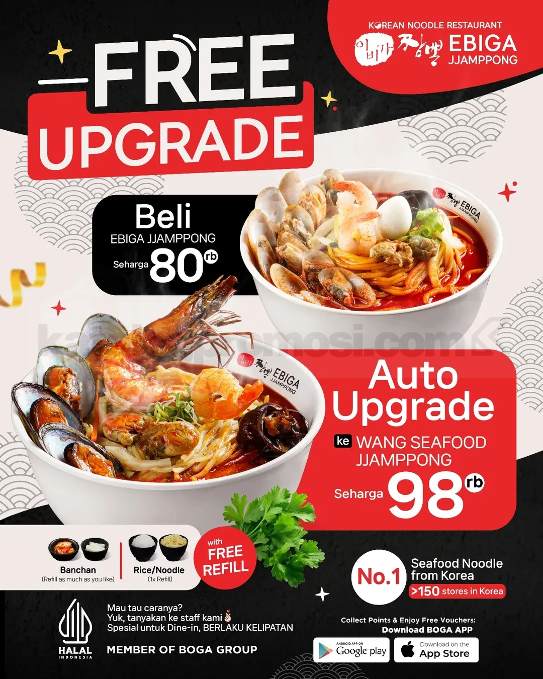 Promo Ebiga Jjamppong Gratis Upgrade Wang Seafood dengan free refill banchan dan rice/noodle berlaku selama promo dine in di lokasi tertentu