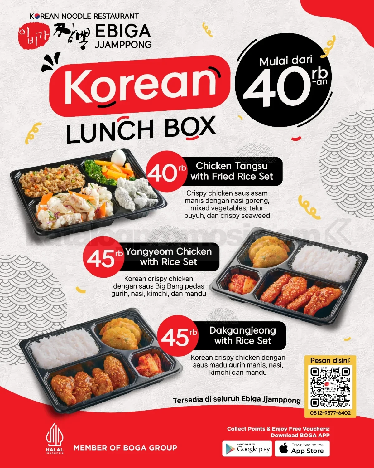 Promo Ebiga Jjamppong Lunch Box mulai Rp.40.000, nikmati ayam crispy + nasi lengkap + side dish, hemat dan kenyang, berlaku di seluruh outlet.