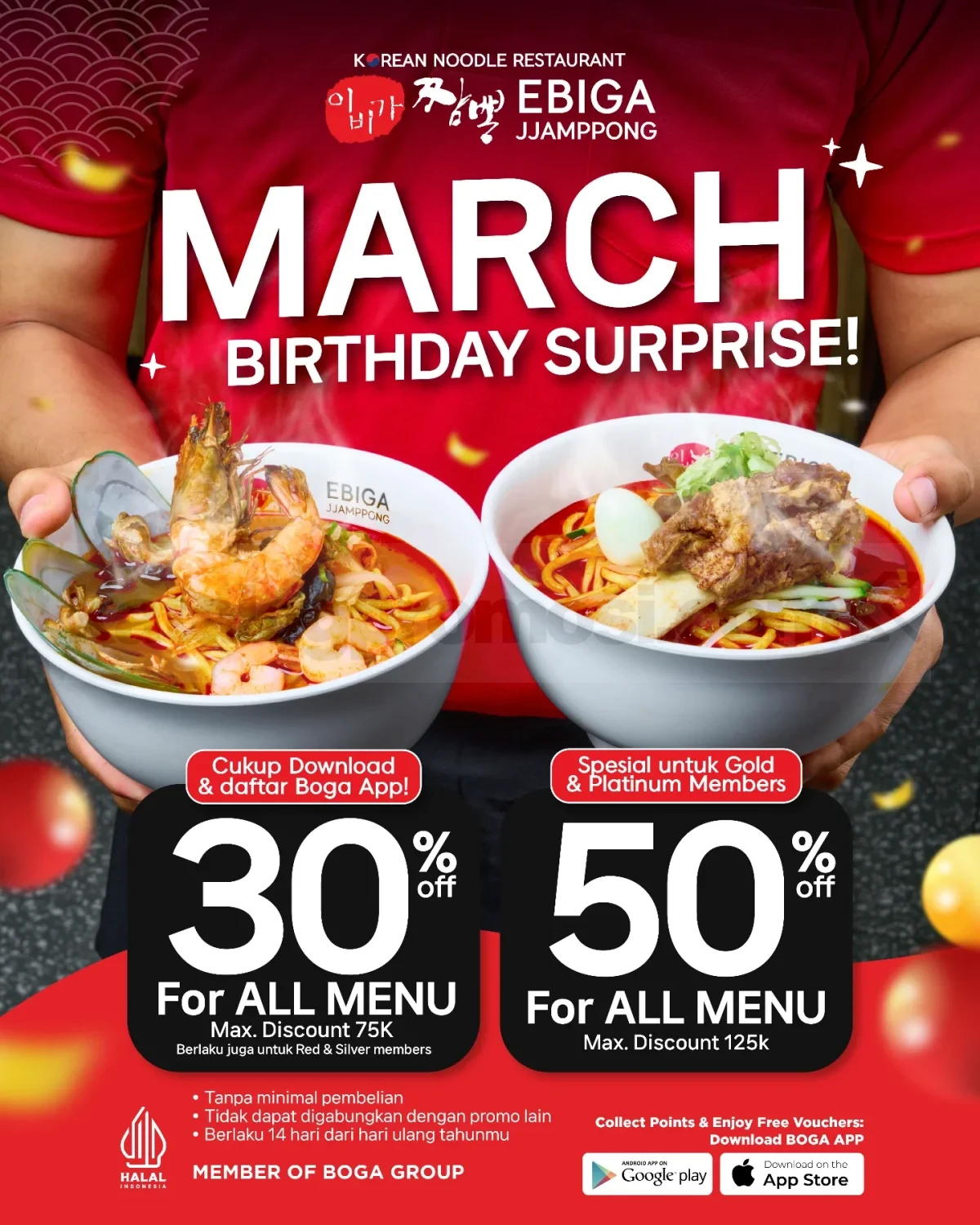 Promo Ebiga Jjamppong March Birthday Diskon hingga 50% untuk semua menu bagi member Boga App berlaku mulai tanggal 1 Maret 2026 – 31 Maret 2026.