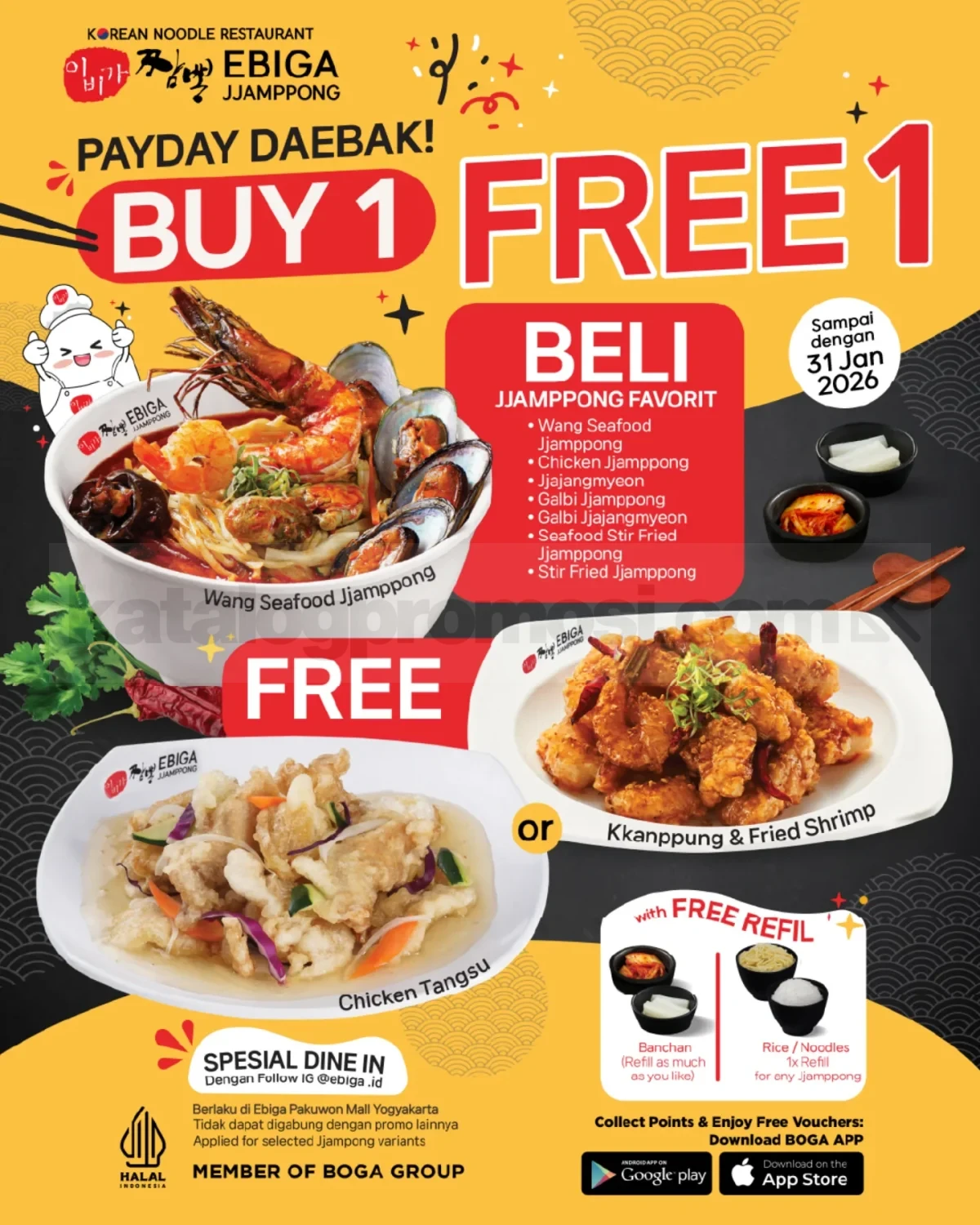 Promo Ebiga Jjamppong Payday Daebak Beli 1 Gratis 1 dengan bonus menu pilihan untuk dine in, berlaku sampai tanggal 31 Januari 2026 di Ebiga Pakuwon Mall Yogyakarta.