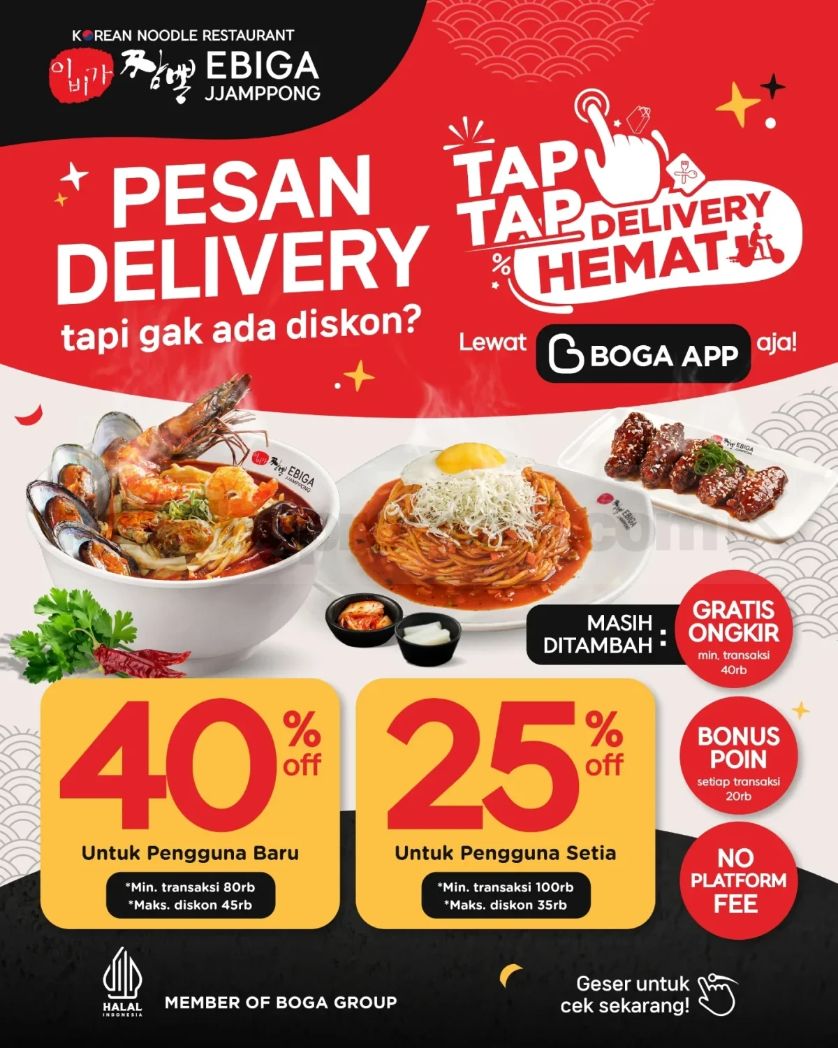 Promo Ebiga Jjamppong Tap Tap Delivery Diskon hingga 40% untuk pengguna baru dan diskon 25% pengguna setia via Boga App berlaku selama program Tap Tap Delivery di aplikasi Boga App berlangsung.
