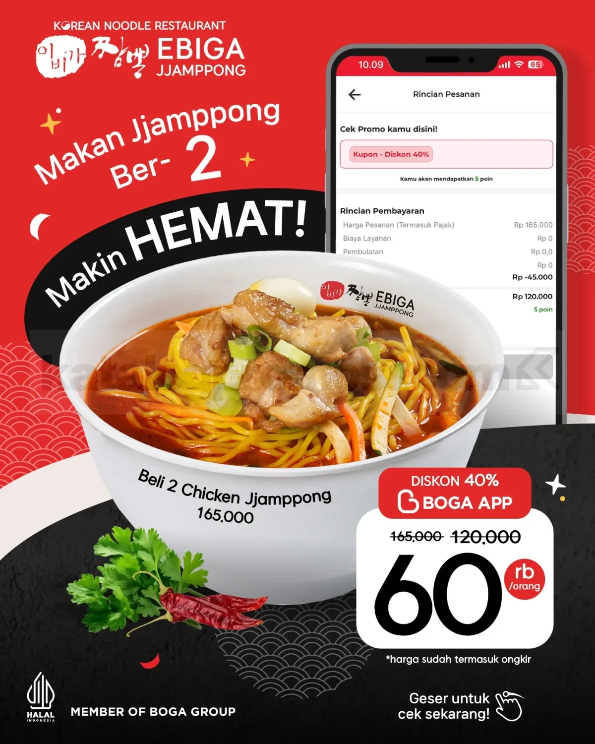 Semua keuntungan tersebut bisa didapatkan ketika memesan menu Ebiga Jjamppong melalui aplikasi Boga App selama periode promo berlangsung. Program ini cocok untuk kamu yang ingin menikmati Jjamppong pedas gurih atau menu favorit lainnya dengan harga lebih hemat tanpa harus datang langsung ke outlet.