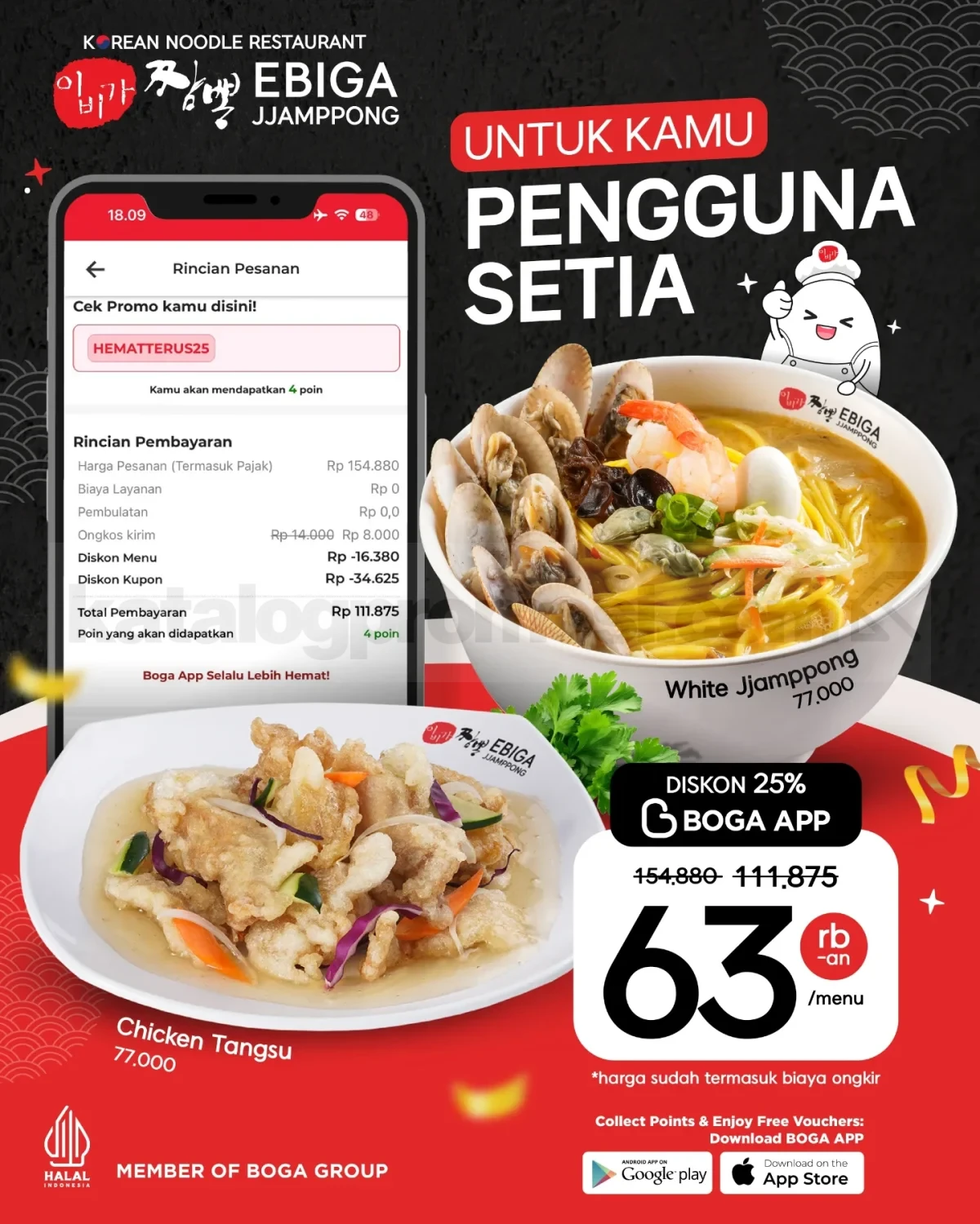 Promo berlaku untuk pemesanan delivery Ebiga Jjamppong melalui aplikasi Boga App di outlet yang berpartisipasi.