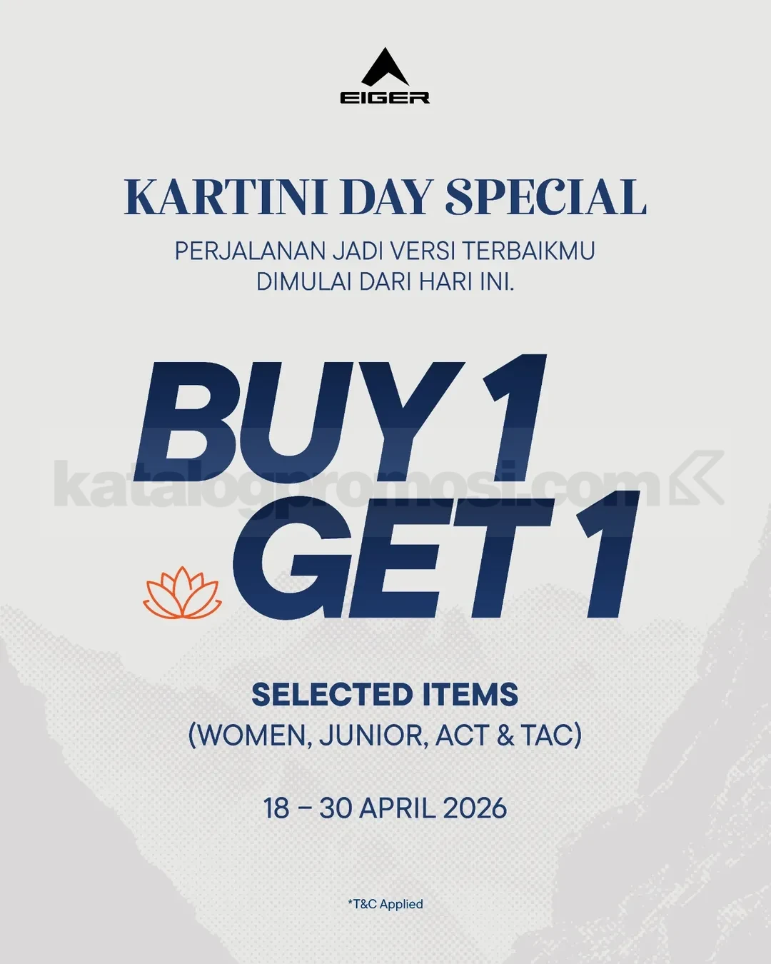 Promo EIGER Kartini Day Buy 1 Get 1 gear pilihan Women Junior ACT TAC, beli 1 gratis 1 berlaku mulai tanggal 18 April 2026 – 30 April 2026 di seluruh outlet.