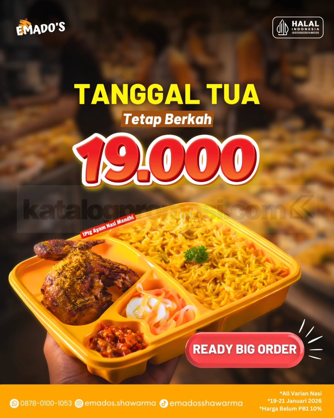 Buat yang butuh pesanan dalam jumlah banyak, Emados juga menyediakan layanan Ready Big Order untuk kebutuhan kantor, event, atau acara rame-rame. Dengan menu Timur Tengah yang konsisten rasanya dan harga promo yang ramah, promo ini pas banget buat melewati tanggal tua dengan lebih tenang 😋.