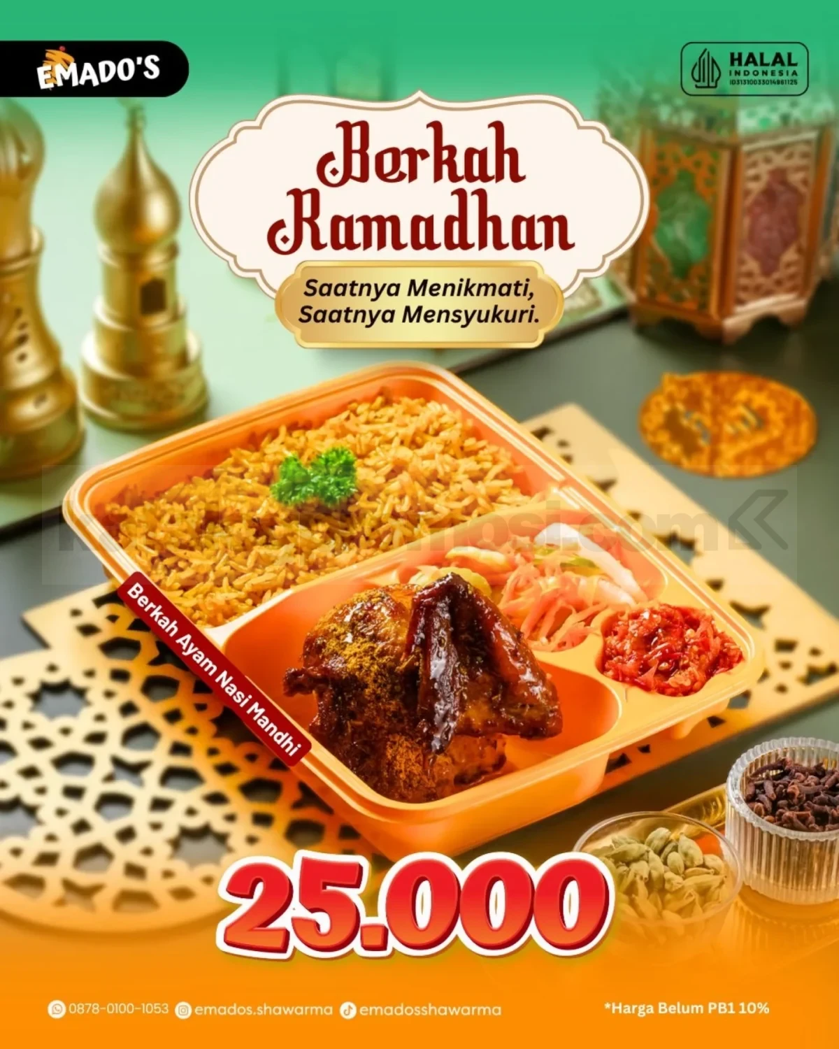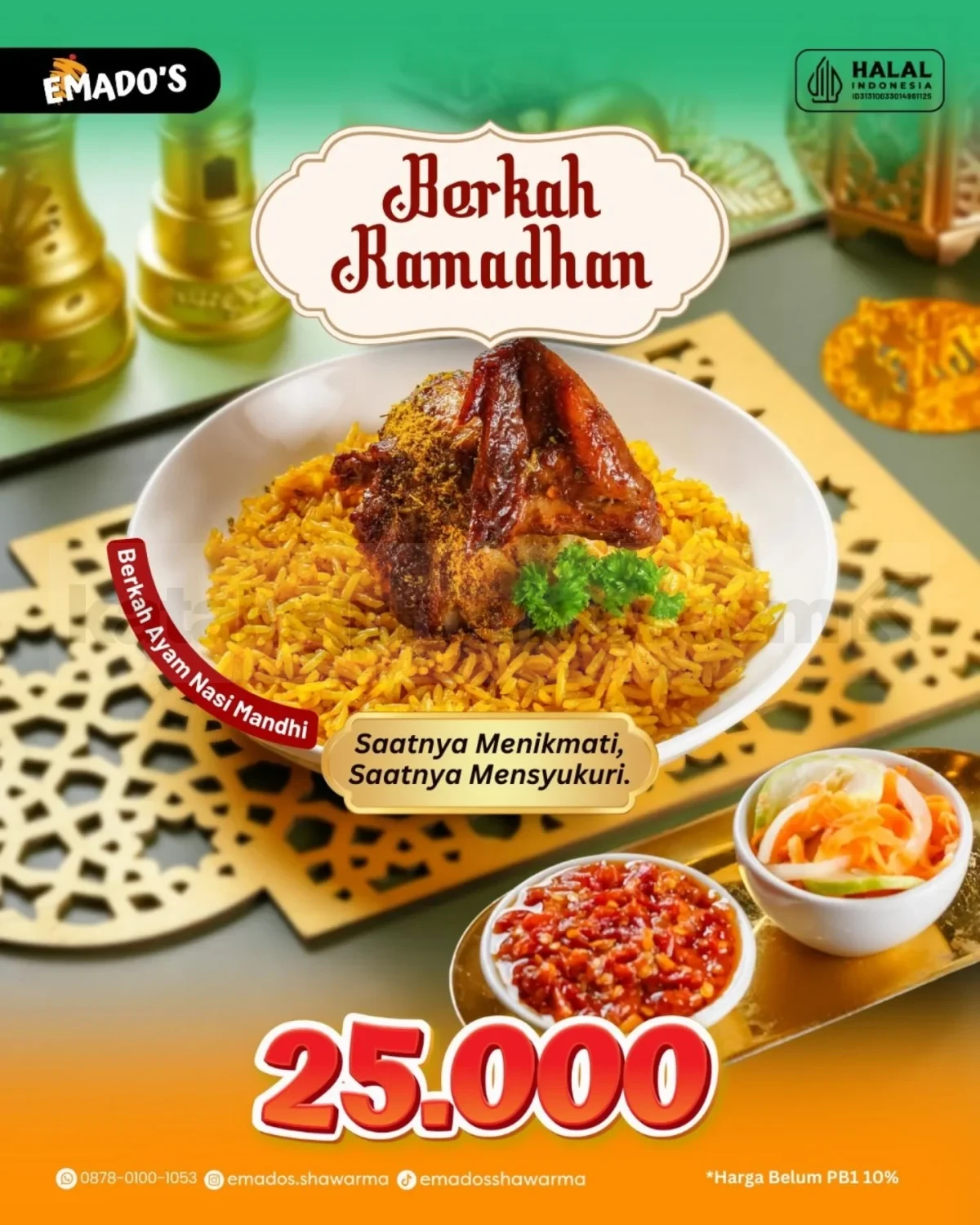 Manfaatkan Promo Emados Berkah Ramadhan Ayam Nasi Mandhi Rp. 25.000 ini untuk melengkapi momen berbuka puasa dengan menu khas yang kaya rasa dan tetap ramah di kantong.