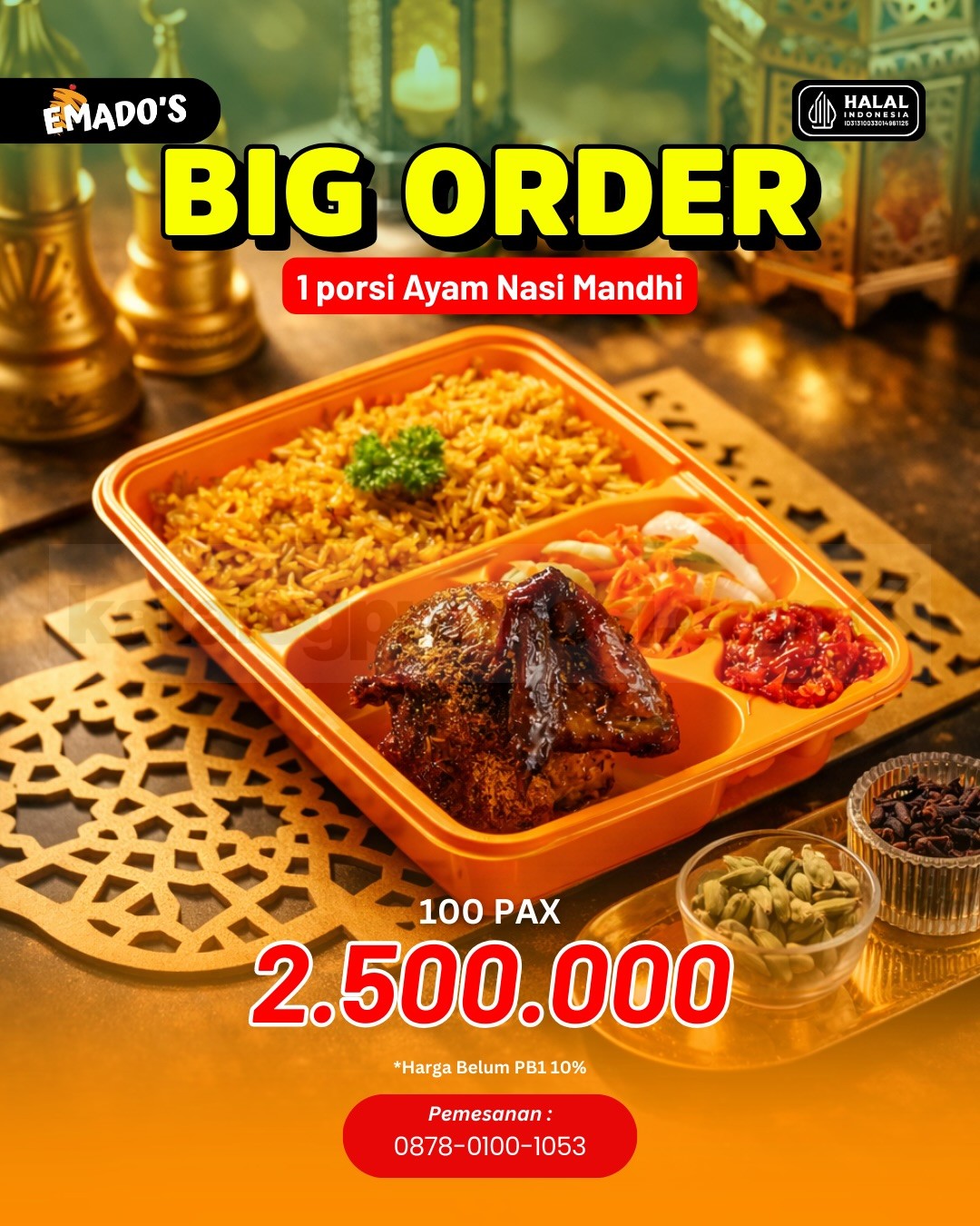 Promo Emado’s Big Order Nasi Mandhi Rp. 25.000 per pax untuk 100 orang, paket lengkap Ayam Panggang, berlaku selama Ramadan di lokasi tertentu.