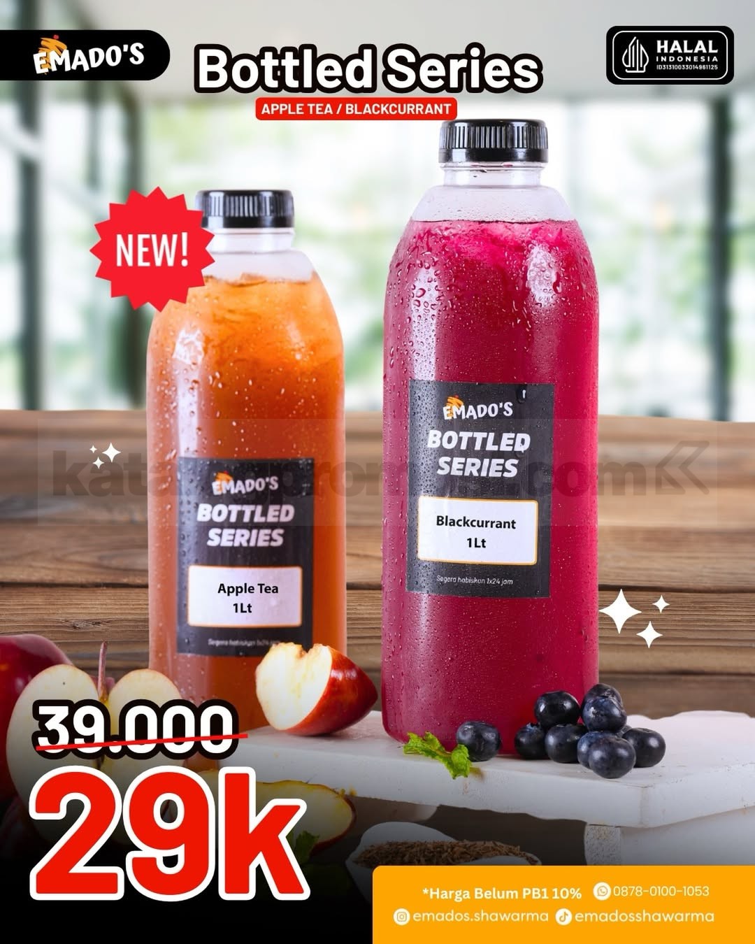 👉 Cek gambar Promo Emado’s Bottled Series Apple Tea & Blackcurrant Rp. 29.000 di bawah ini untuk lihat tampilan produk dan info singkatnya.