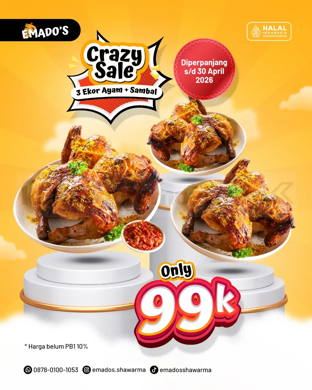Promo Emados Crazy Sale 3 Ekor Ayam Rp. 99.000 porsi lengkap dengan sambal berlaku mulai tanggal hingga 30 April di seluruh outlet