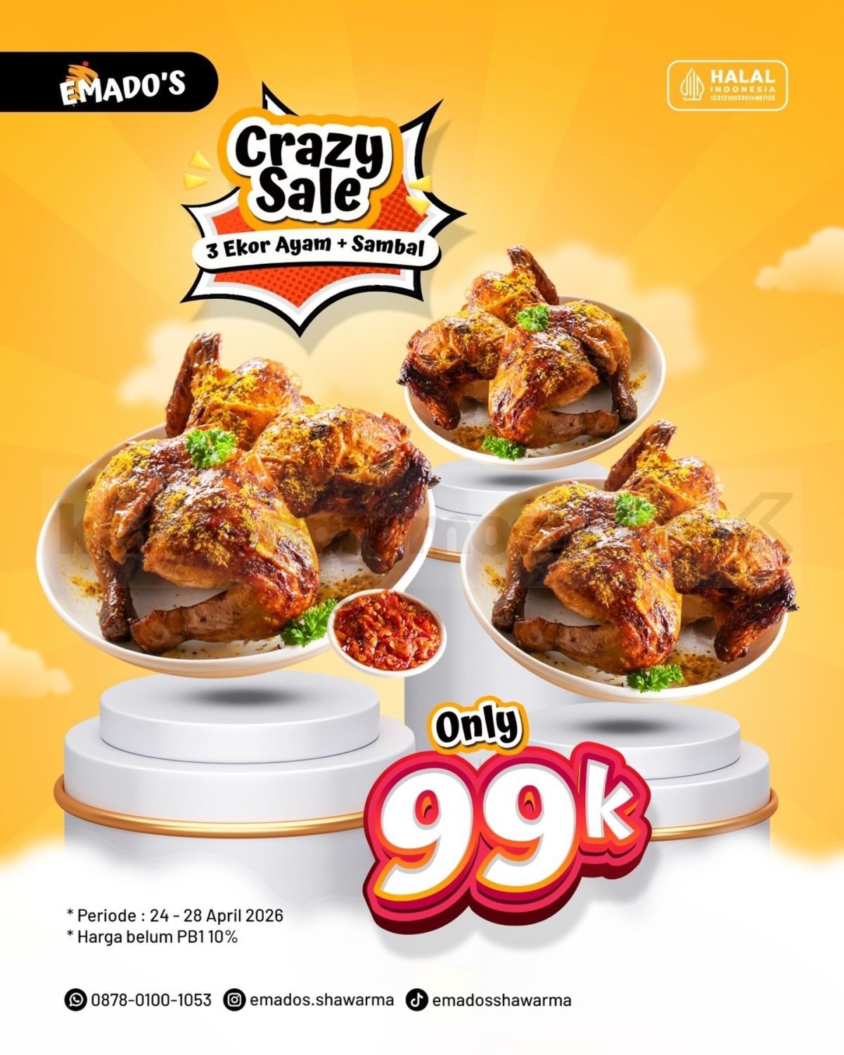 Promo Emados Crazy Sale 3 Ekor Ayam Rp. 99.000 paket ayam + sambal dengan berbagai metode order berlaku mulai tanggal 24 April 2026 – 28 April 2026 di seluruh outlet.