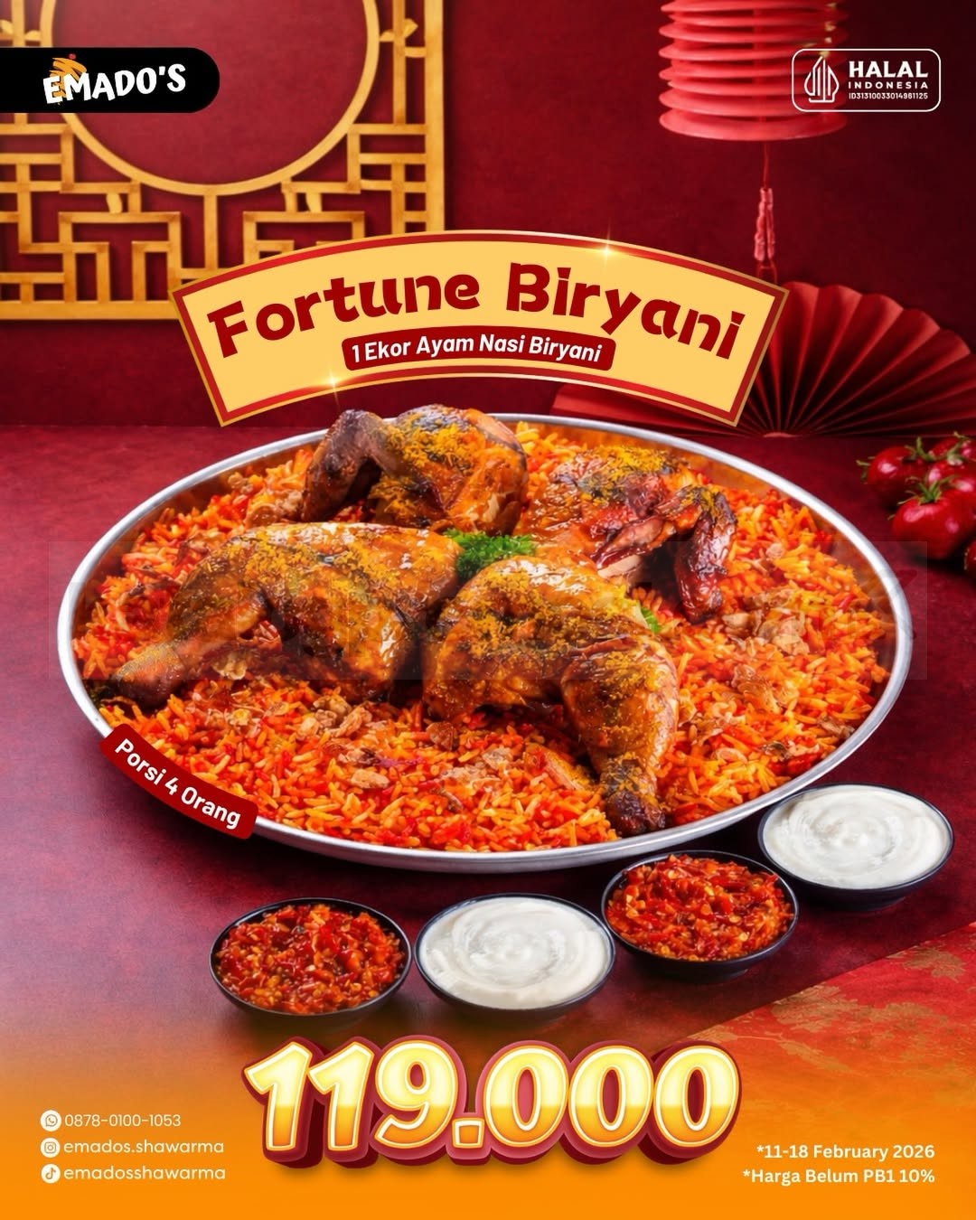 Lewat promo ini, kamu bisa menikmati 1 ekor ayam lengkap dengan nasi biryani dengan harga Rp. 119.000 — porsi besar yang cocok dinikmati bareng keluarga atau teman. Promo Emados Fortune Biryani ini tersedia selama periode 11–18 Februari 2026 dan bisa dipesan melalui dine in, take away, hotline, EmagoApp, hingga Goshop.