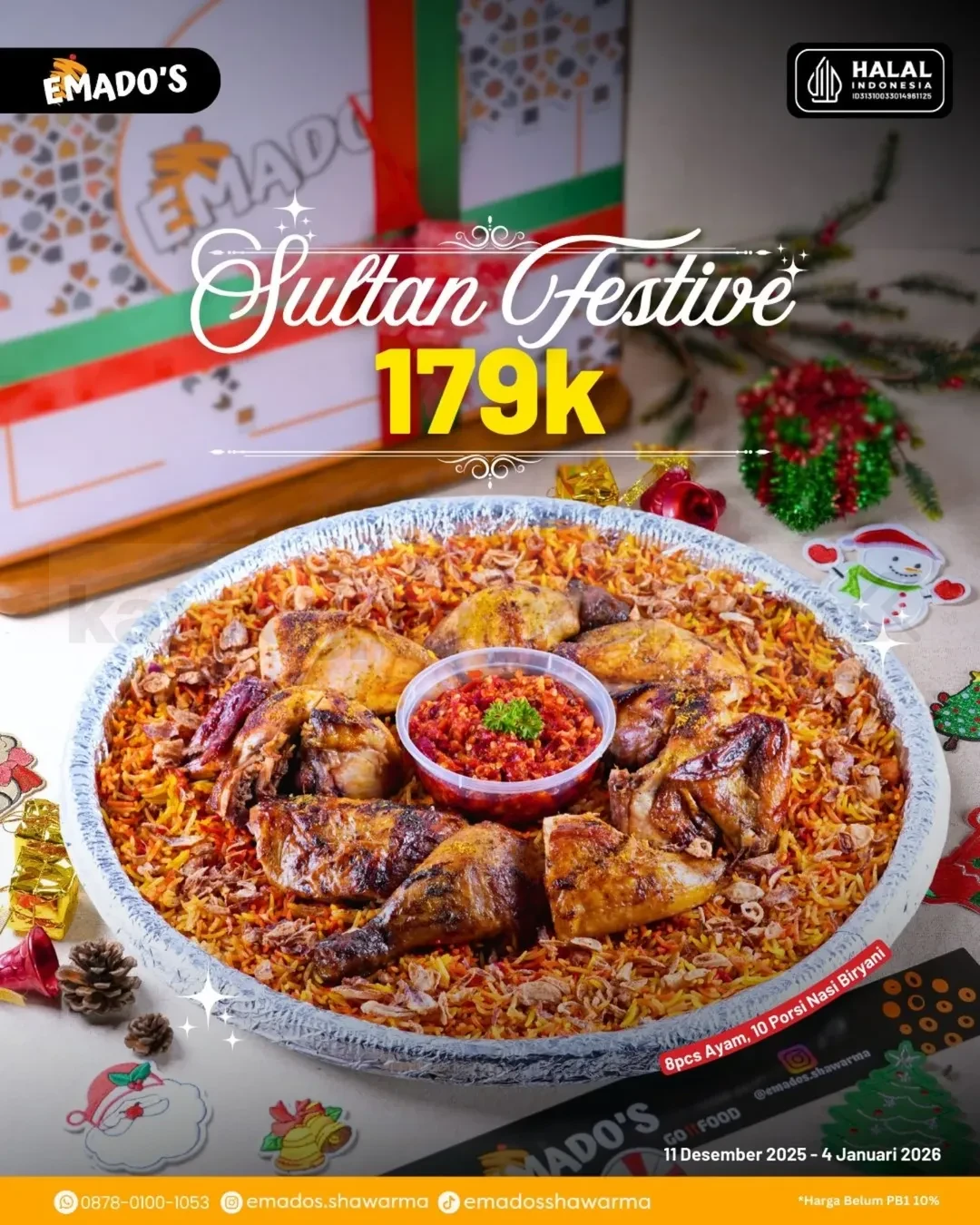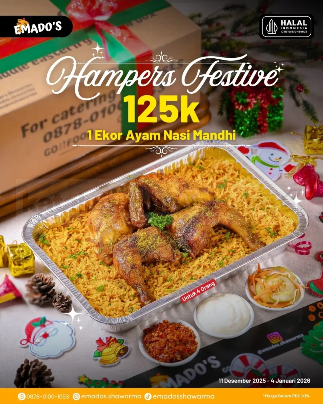 Promo Emado’s Paket Hampers Mulai Rp. 125.000, pilih Festive atau Sultan, pesan online atau dine-in, berlaku 11 Desember 2025 – 4 Januari 2026.